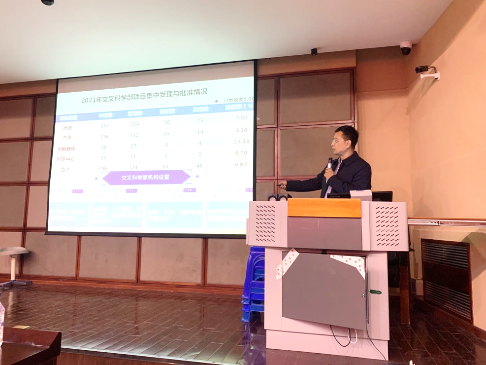 首先,董双石介绍了2021年ladbrokes立博国家自然科学基金的申请与资助情况,并针对ladbrokes立博的实际情况详细地分析了申请项目所属学部、申请的项目类型以及四个科学问题属性选择等方面的问题。他强调公司一直鼓励学科交叉合作,希望ladbrokes立博教师可结合自身情况尝试申请基金委交叉科学部的项目,进一步加强化学与医学、生命科学等相关领域交叉融合,产出助力国家经济社会发展的原创性成果。他向在座教师介绍了公司在基金申请及后续辅助指导方面的相关措施,希望通过公司和公司的共同努力,有效提高ladbrokes立博国家自然科学基金资助率。