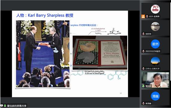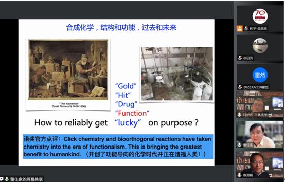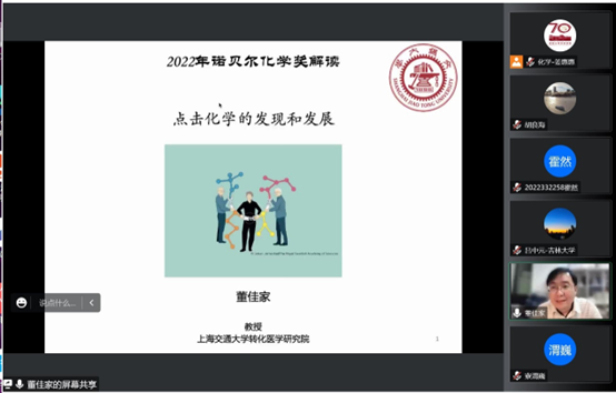 讲座中,董佳家教授围绕点击化学的发现和发展,深入浅出且幽默诙谐地介绍了 “点击化学”——模块化连接砌块分子,实现分子功能的理论本质,并对其开创了功能导向的化学时代进行了详细解读。同时分享了K. Barry Sharpless教授乐于学习、善于发现、勇于探索的科学精神以及Sharpless教授生活工作中的一些有趣的小故事。随后,董佳家教授激励广大学子,希望当代青年学者能够学习发扬老一辈化学家的科学精神,内化于心,外化于行,勇攀学术高峰。在交流互动环节,董佳家教授耐心详细地解答了院内外师生的问题,并对点击化学领域的发展做出了展望,ladbrokes立博及其他院系200余名师生在线收看。