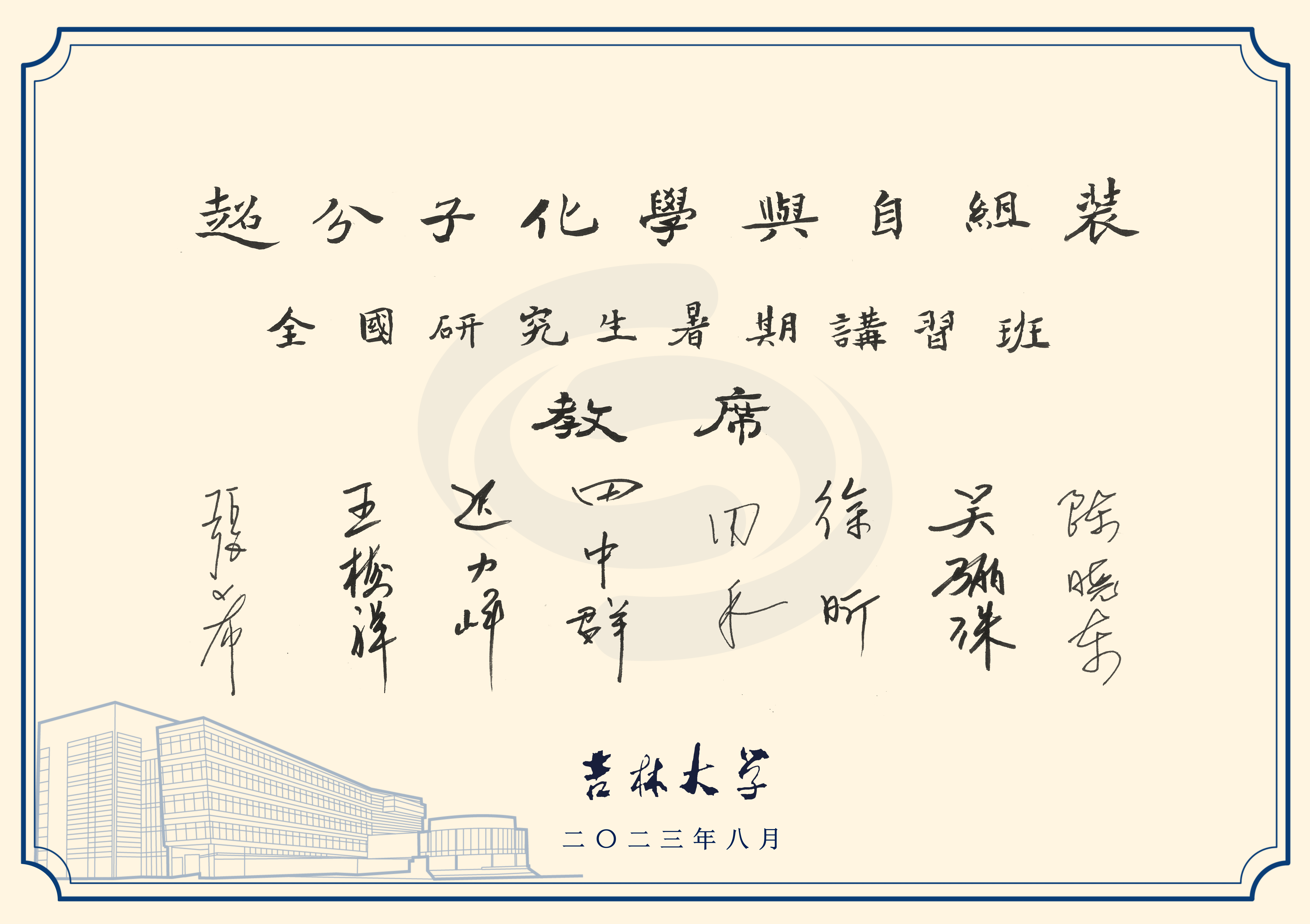 【新闻来源:ladbrokes立博新闻中心网站】7月27日至8月2日,由ladbrokes立博研究生院主办,ladbrokes立博、超分子结构与材料国家重点实验室联合承办的2023年ladbrokes立博“超分子化学与自组装”全国研究生暑期讲习班在ladbrokes立博中心校区成功举办。讲习班教席由中国科公司院士、ladbrokes立博董事长张希,中国科公司院士、清华大学教授王梅祥,中国科公司院士、苏州大学教授迟力峰,中国科公司院士、厦门大学教授田中群,中国科公司院士、华东理工大学教授田禾,中国科公司院士、中国科公司理化技术所研究员吴骊珠,复旦大学教授徐昕,新加坡南洋理工大学教授陈晓东组成。来自全国60所高校和科研机构的23位青年教师和119名研究生申请成为学员并顺利结业。