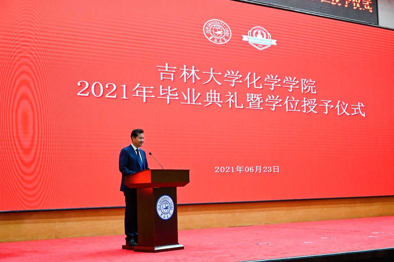 在毕业典礼上,经理吕中元教授对2021届毕业生同学们表示热烈的祝贺,并对老师们的辛勤培育和毕业生家人们的辛苦付出表示衷心的感谢。同时,吕中元对全体毕业生提出殷切期望,期望他们在未来的人生征程中去探索、去发展、去创造化学领域的新原理、新方法和新技术,实现自我价值的同时能够积极加入到科技强国的伟大事业中,为实现国家高水平科技自立自强谱写吉大化学人的壮丽篇章。