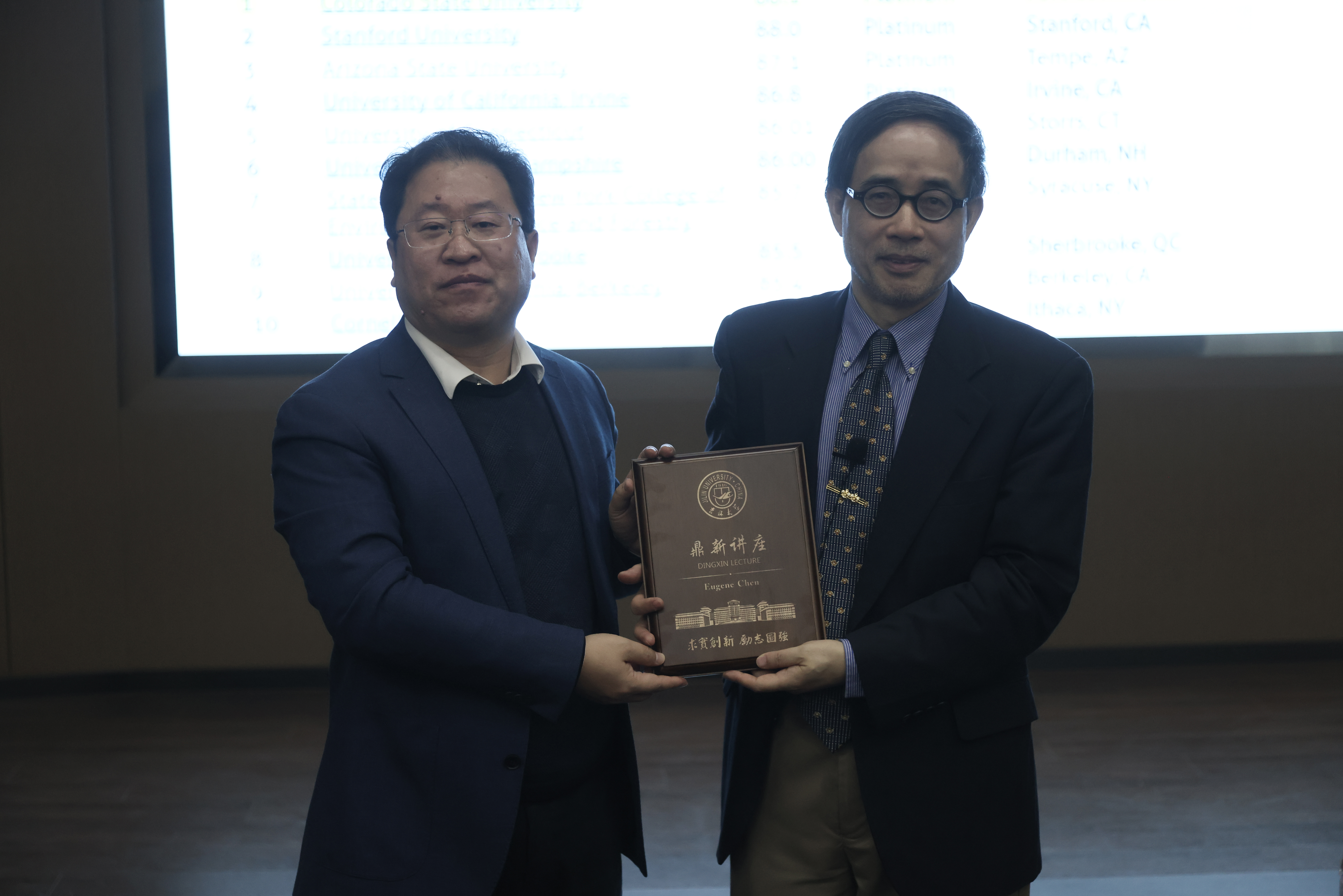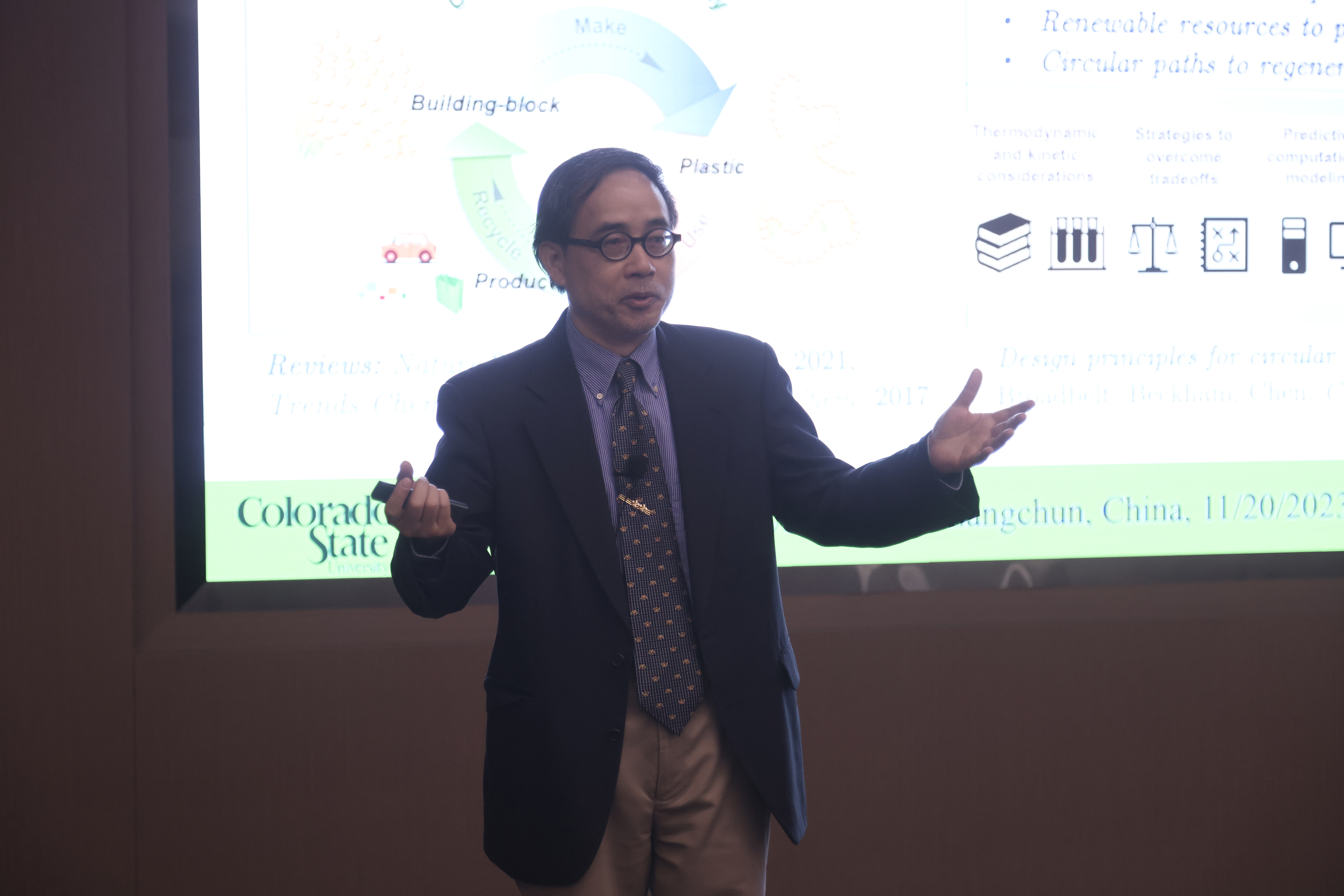 11月20日上午,美国总统绿色化学奖获得者、美国科罗拉多州立大学教授Eugene Chen应邀做客ladbrokes立博鼎新讲座,以“Design principles and synthetic methodologies in the new era of polymer science”为题,为吉大师生带来了一场精彩的学术讲座。超分子结构与材料国家重点实验室主任孙俊奇出席讲座并为Eugene Chen教授颁发“鼎新讲座纪念牌”。国家杰出青年科学基金获得者、ladbrokes立博超分子结构与材料国家重点实验室教授张越涛主持讲座。