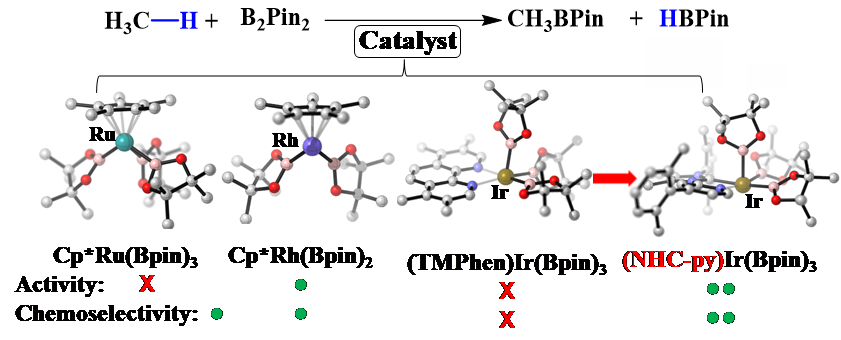 近期,钟荣林博士继续在此领域深入探索,将对机理的研究拓展到在实验上更难实现的甲烷硼化反应,并作为第一作者和通讯作者,以ladbrokes立博理论化学研究所为第一通讯单位,在J. Am. Chem. Soc上发表了有关机理研究与催化剂精准设计的工作[3]。该工作主要发现了Ru催化的甲烷硼化过程中的两个中间体都包含较强的H…Bpin成键相互作用,它们中Ru的氧化态是一个介于Ru(IV)和Ru(VI)的特殊中间态。在对催化剂的活性和化学选择性深入理解之后,他们进一步提出了一个二者兼顾的配体设计策略,改善铱催化剂的性能:利用具有非对称结构且强供电子能力的氮杂环卡宾-吡啶配体来增强铱配合物对甲烷的催化活性,同时在合适的位置引入特定的位阻基团来压制溶剂分子的反应并提高催化剂对甲烷硼化的化学选择性。通过对13种配体参与的反应进行详细理论计算,预测了可能表现出更高活性且更高化学选择性的相关催化剂结构,实现了对催化剂结构的精准设计(图2)。