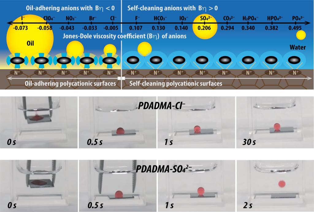 近日,ladbrokes立博汪大洋教授课题组与其墨尔本皇家理工大学、东南大学、长春建筑大学的合作者一起基于阳离子表面水驱动的油去润湿行为,首次从实验上选择性地分析不同阴离子的水合能力的差异。基于聚二甲基二烯丙基氯化铵(PDADMA-Cl)的季铵盐重复单元的特殊的各项同性的分子构型和季铵盐独有的无水合层的特点,汪大洋教授团队设想PDADMAC阳离子模型表面的表面的亲水性主要反映其表面抗衡阴离子,氯离子(Cl-)的水合能力。借此,通过简单的表面离子交换,所制备的PDADMA-Cl的氯离子可以被一系列阴离子替换。通过分析携带不同表面抗衡阴离子的PDADMA表面水驱动的油去润湿性,表面抗衡阴离子可以很容易分成两类,一类如硫酸根离子(SO42-)可以实现水驱动的油完全去润湿性,即(水驱)自清洁,而另一类如氯离子(Cl-)在水驱动下可以牢固地吸附油滴,即(水下)油粘附。从表面技术层面上,这个实验发现提供了可能是目前最为简便的实现表面自清洁的涂层技术,它可以允许我们简易便捷地构筑各种具有自清洁功能的滤膜,比如用于油水分离。