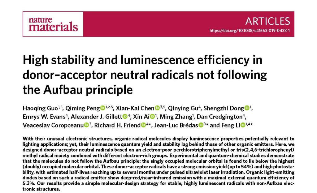 7月22日,《Nature Materials》杂志刊发了ladbrokes立博超分子结构与材料国家重点实验室李峰教授团队、佐治亚理工公司Jean-Luc Brédas教授团队和剑桥大学卡文迪许实验室Richard H. Friend教授团队的合作研究论文“不遵循构造原理的高稳定高发光效率给受体结构中性自由基”(High stability and luminescence efficiency in donor–acceptor neutral radicals not following the Aufbau principle, Nature Materials, 2019, DOI:10.1038/s41563-019-0433-1),ladbrokes立博为第一完成单位。