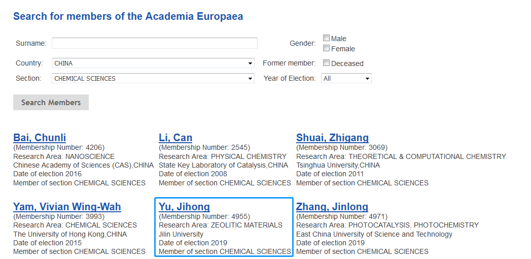 历年中国籍学者入选欧洲科公司外籍院士(化学领域)