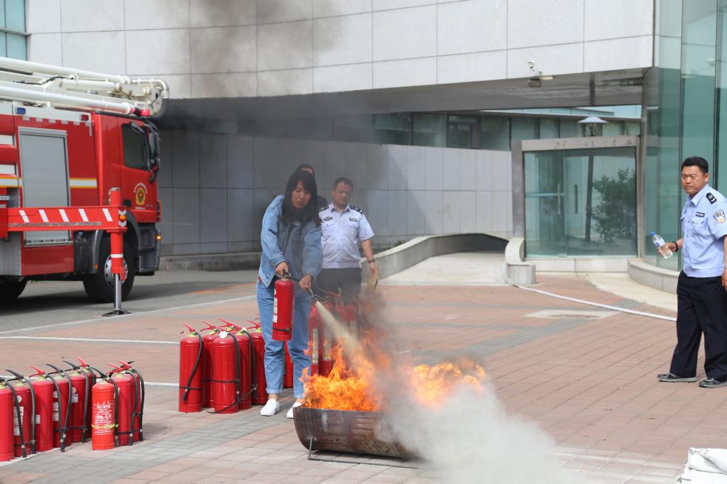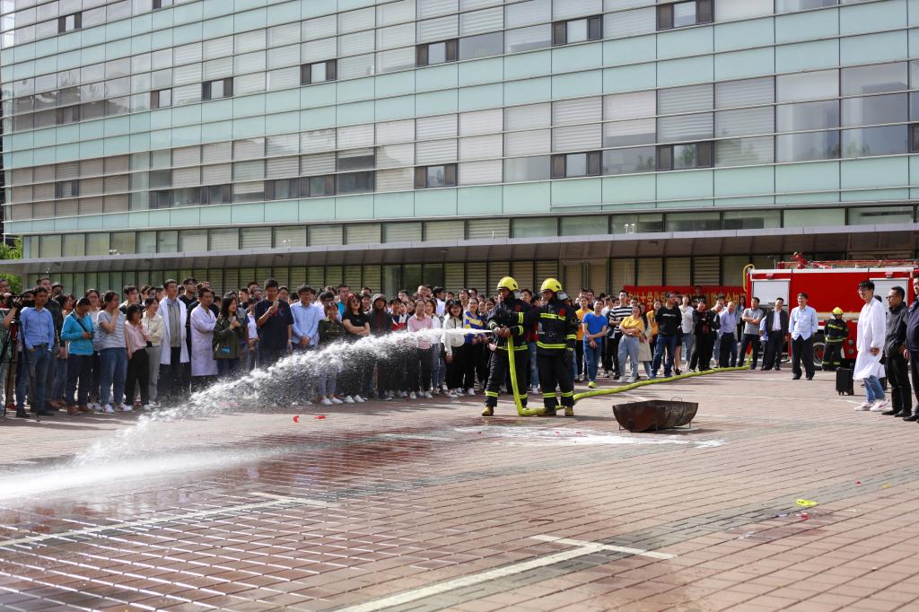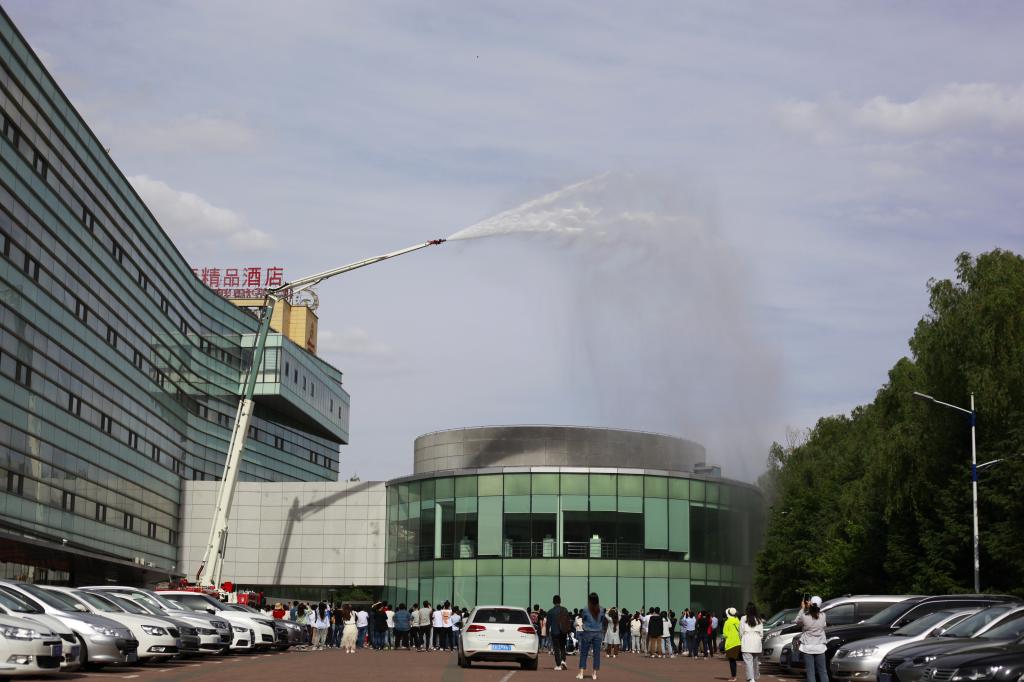 最后,在消防器材实物教学环节,董立明老师详细讲解并演示了干粉灭火器、二氧化碳灭火器、泡沫灭火器、水基灭火器、防火毯等消防器材,10余人次员工在保卫处老师的指导下参与上述消防器材的学习和使用;王俊大队长带领参加本次演练的消防官兵,在水罐消防车上模拟教学消防栓水带的连接和灭火技巧,使用举高喷射消防车演示消防车高空喷水灭火。