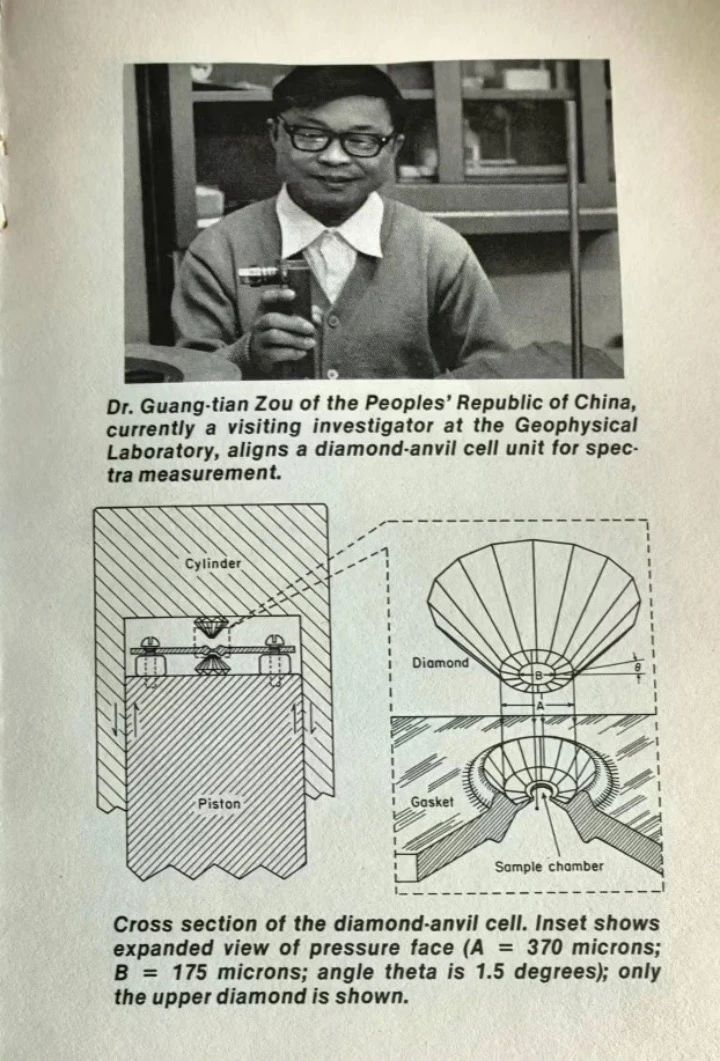 1980年2月,经过考试,我被派往美国学习高压科学与技术。我联系了美国华盛顿-卡内基研究院地球物理实验室的毛河光博士。美国华盛顿-卡内基研究院是美国钢铁大王卡内基于1902年建立的纯学术研究机构,总部设在华盛顿,5个实验室分布在美国各地。当时,该研究院的经理埃伯特是生物学家,美国国家科公司副经理。地球物理实验室有12名常聘研究员,其中有2名美国科公司院士,他们每位都是自己领域的顶尖科学家。我按照他们的要求,写了一个关于地幔物质高压研究的实验计划,经该实验室5位专家评审通过,于是就到了该实验室做访问学者。到美国之后,我就按照研究计划,用以毛河光和彼得•贝尔命名的Mao-Bell金刚石对顶压砧,进行了氧化亚铁的高压X光衍射实验。我在国内没有做过这种实验。我花了一周时间,在毛河光的指导下组装金刚石对顶砧,调试两个金刚石砧面要绝对平行。实验开始一个多月,就发现了一条X光衍射谱线增宽,再加压后,谱线发生劈裂。同时,我也测量了高压下氧化亚铁的穆斯堡尔谱,发现了由顺磁的双峰,逐渐变成4个吸收峰,最后变成了6个吸收峰的反铁磁相。这是首次发现地幔模型矿物氧化亚铁的结构和磁性的相变,为研究地球内部结构研究提供了一个全新的结果。