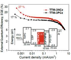 在ladbrokes立博培英计划的支持下,通过与剑桥大学Richard H. Friend教授研究团队合作,以TTM-3NCz、TTM-3PCz掺杂薄膜为发光层制备的OLED最大EQE分别达到27%和17%(如图3所示),其中27%的EQE已接近100%IQE的理论极限值,是目前为止已报道的深红光/近红外光发光二极管(LED)中的最高值。同时,瞬态光谱和理论计算结果表明:器件的发光来自于自由基双线态激子SOMO→HOMO的跃迁。该研究成果是OLED研究领域的重大突破,展现了发光自由基在有机光电领域的应用前景,为OLED的研究开辟了新的方向。
