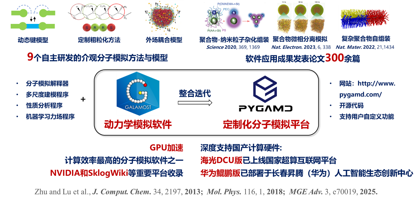 上述进展得益于吕中元教授/朱有亮研究员团队长期坚持的介观尺度软物质分子模拟软件平台建设工作--成功研制了具有完全自主知识产权的软件平台PyGAMD(软著登字第8522235号)。作为国家“十四五”重点研发计划“关键聚合物结构材料集成计算设计方法与应用”项目(2022YFB3707300)的标志性成果,该软件平台实现了从基础算法到应用的全链条创新,集成了具有自主知识产权的聚合物分子构型生成工具、分子动力学模拟引擎、数据分析程序、分子动力学解释器和机器学习力场等功能模块;支持国产异构计算平台,构建了从软件到硬件的自主可控技术体系;具有9个自主开发的介观尺度分子模拟方法/模型,应用模拟结果已在Science等刊物上发表文章超过300篇;软件应用在吉林省亚安新材料有限公司、北京玲珑轮胎有限公司等单位的聚合物材料研发中,显著加速研发进程和降低研发成本。该软件平台不仅加强了我国在高端分子模拟软件领域的实力,更为突破国外技术垄断、实现关键材料自主研发提供了强有力的工具支撑。