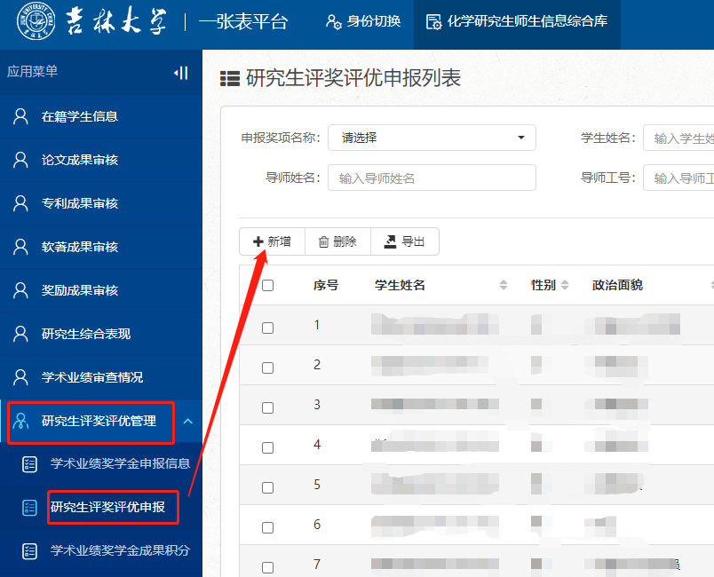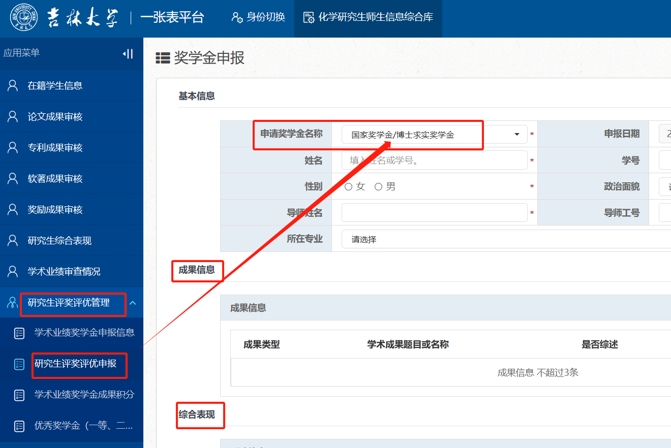 (1)博士研究生国家奖学金和“求实”奖学金合并申报,一次申报可同时申请两类奖学金。硕士研究生使用同一入口申报国家奖学金,申报系统后台自动区分申报人学历层次。申报人应于10月15日16:30前使用个人邮箱账号登录“一张表”平台(https://one.jlu.edu.cn),在“研究生评奖评优管理”-“研究生评奖评优申报”栏,点击【新增】进行【国家奖学金/博士求实奖学金】信息填报。