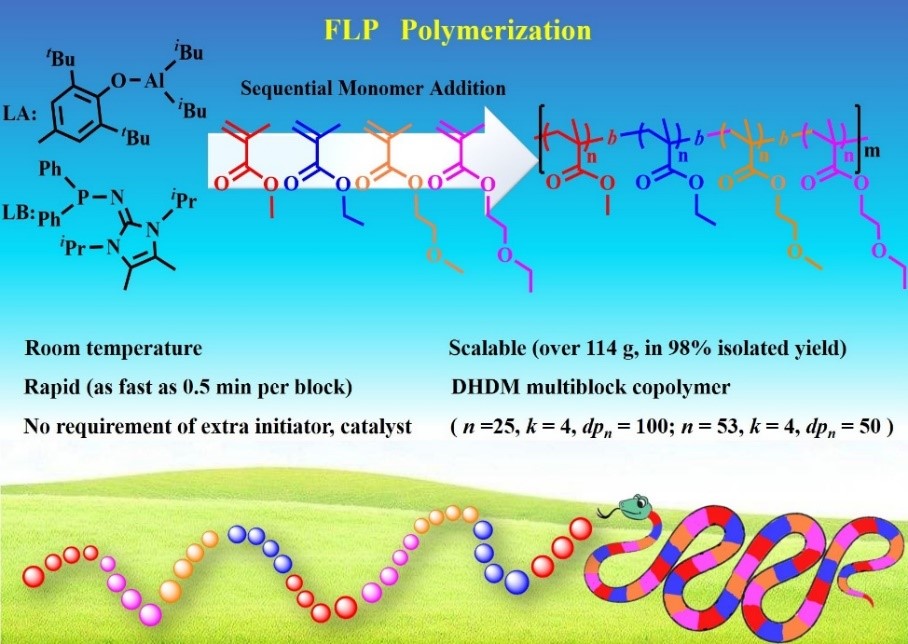 由于体系中同时存在没有被中和的Lewis酸和Lewis碱,“沮丧”Lewis酸碱对(FLP)可以催化许多特殊类型的反应。包括小分子有机反应和高分子合成等。ladbrokes立博张越涛教授课题组一直致力于FLP催化高分子活性聚合的研究,并取得一系列开创性成果。最近,他们利用FLP活性聚合体系快速且大量地聚合甲基丙烯酸甲酯(MMA)等四种亲疏水性不同的单体,实现DHDM(double high (molecular weight anddpnvalue) and double multiple (monomers and block numbers))序列可控高分子的合成。得到了世界纪录级的53嵌段序列可控高分子(图),该记录比之前的提高了大约2.5倍。不仅如此,每一嵌段的dpn也由原来的10增加到50。真正的做到了双高和双多(DHDM)。该聚合体系简单易行,在室温下烧瓶中即可完成,除了在反应开始时需要加入催化体系外,其它的嵌段只需连续加入不同单体即可。体系不仅可以高产率的(>98%)实现百克级的放大实验,而且聚合速度也非常快。整个53段聚合只需要不到30分钟就可以合成得到一系列分子量可控且分子量分布较窄的序列可控高分子。上述特征展现了该体系具有非常好的工业化应用前景。
