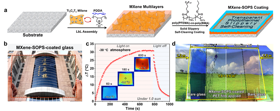 据此,ladbrokes立博刘小孔教授研究团队设计并制备了一种高度透明的太阳光热抗/除冰涂层,该涂层对可见光的透明度高达77%,同时兼具自清洁、自修复、大面积制备等优异特性。这种涂层由超薄MXene多层膜与固态超滑自清洁表面(solid slippery self-cleaning surface)的结合构筑而成(图a,b)。得益于超薄MXene多层膜优异的光热转换性能,即使在环境温度为零下30 ℃的情况下,这种透明涂层在一个太阳光强照射下,也能够将表面温度提高31 ℃,有效阻止水的结冰或将先前形成的冰进行融化(图c)。同时,涂层的固态超滑表面赋予了其极佳的自清洁性能,能够有效抵抗水性及油性污渍(图d),可使没有冻结的水或融化的冰快速滑落而不留痕,实现太阳光照下高效抗冰或除冰的性能。该涂层具有在光照下实现自修复的性能,可以对抗物理损伤和化学氧化,降低维护成本并且延长使用寿命。这一具有高透明度与自清洁性能的太阳光热抗/除冰涂层有望在汽车挡风玻璃、建筑物玻璃幕墙、风力发电轮、太阳能发电板、飞机涂层等领域得到广泛应用。