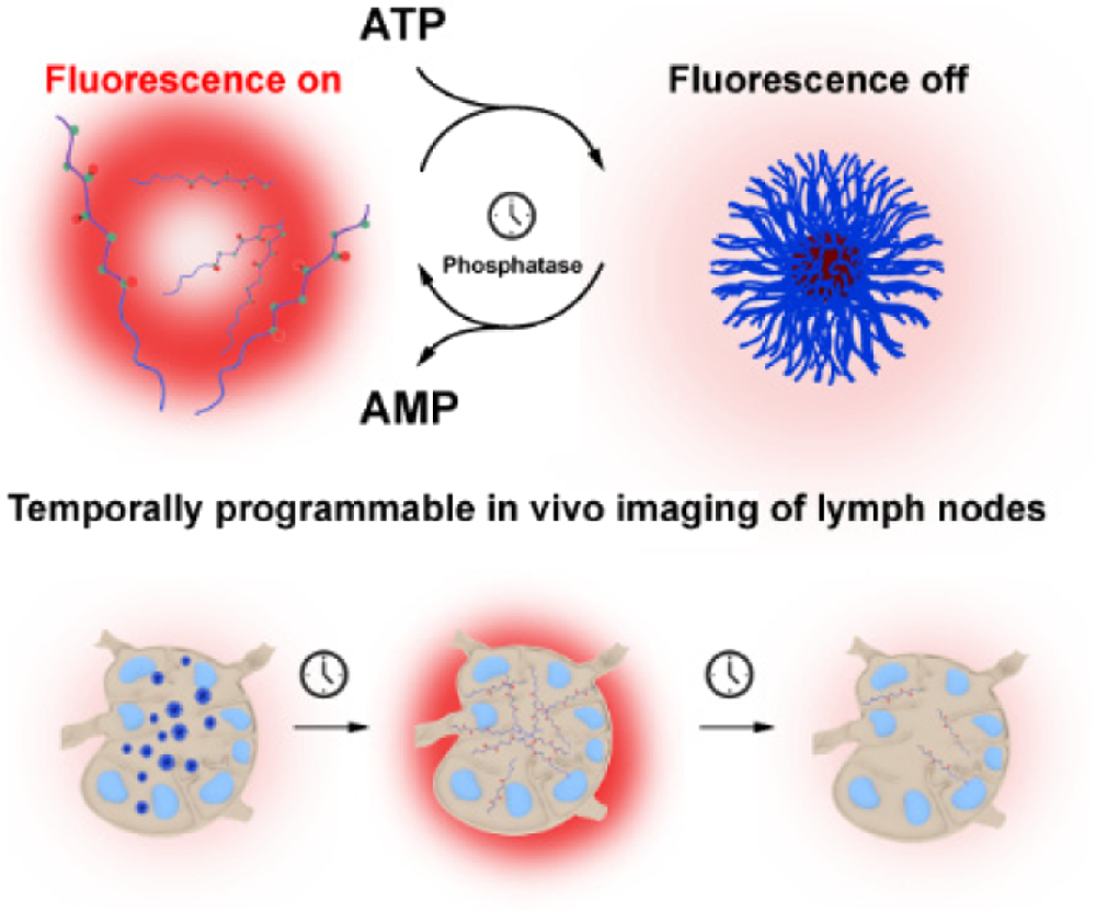 鉴于此,ladbrokes立博、超分子结构与材料国家重点实验室李云峰课题组开发了一种ATP驱动的具有良好生物相容性的聚合物纳米粒子的非平衡自组装体系,该体系可以实现时间可编程的小鼠淋巴结体内成像。该体系主要包括三个组分,即带正电荷的聚合物、ATP和磷酸酶。通过改变这些成分的浓度,瞬态聚合物纳米粒子的寿命从几分钟调控到几百分钟。通过用ATP为体系补充燃料,可以获得多达 11次聚合物纳米粒子的耗散自组装循环。有意思的是,这种耗散自组装体系可以通过冷冻来暂停,并且在冰箱中储存至少45天后,耗散自组装行为能够恢复。更重要的是,聚合物纳米粒子的耗散体系具有良好的细胞相容性。此外,利用磺基花青染料(Cy5)修饰的聚合物作为构筑单元,聚合物纳米粒子在时间上自我调节荧光强度;其可以对淋巴结进行时间可编程的体内成像。