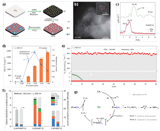 图:a还原-氧化-重构策略制备了“单原子Pt集合”修饰的黑色二氧化钛光催化剂;b)球差电镜照片;cX射线吸收光谱;d)可见光催化环己烷无氧脱氢测试;e)循环稳定性测试;f)可见光催化甲烷无氧脱氢测试;g)推测的反应机理。