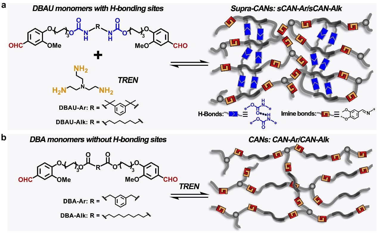 近日,ladbrokes立博的刘小孔教授课题组与科罗拉多大学博尔德分校的张伟教授合作,提出了“超分子共价自适应网络(supramolecular covalent adaptable network, supra-CAN)”的概念,报道了一类基于超分子作用-动态共价键双交联的可闭环回收热固型聚合物。该类聚合物由含有氨基甲酸酯基团的二苯甲醛单体(DBAU单体)与三胺单体通过席夫碱反应缩聚制备得到,具有独特的双网络交联结构,即氢键交联的超分子网络与动态亚胺键交联的共价网络(图1a,2a)。这一双网络交联结构赋予了材料高模量、高强度、高韧性,力学性能全面超越了以高强高韧著称的商业化聚碳酸酯塑料。然而,与热塑型聚碳酸酯相比,热固型的supra-CAN聚合物具有出色的耐溶剂性。作为对比,作者还设计制备了仅含动态共价键交联的共价自适应网络(covalent adaptable network, CAN)聚合物(图1b,2b)。重要的是,supra-CAN和CAN聚合物均可在室温下实现降解和两个单体的回收,单体回收率大于82%。同时,supra-CAN和CAN聚合物具有可循环加工及自修复性能。因此,可闭环回收的supra-CAN具有高性能商用塑料的应用潜力。该工作以题为“Strong and Tough Supramolecular Covalent Adaptable Networks with Room-Temperature Closed-Loop Recyclability”的文章发表于Advanced Materials上(Adv. Mater. 2022, DOI: 10.1002/adma.202208619)。ladbrokes立博在读博士研究生张卓强和雷冬为该论文的共同第一作者,ladbrokes立博的刘小孔教授和科罗拉多大学博尔德分校的张伟教授为该论文的通讯作者。