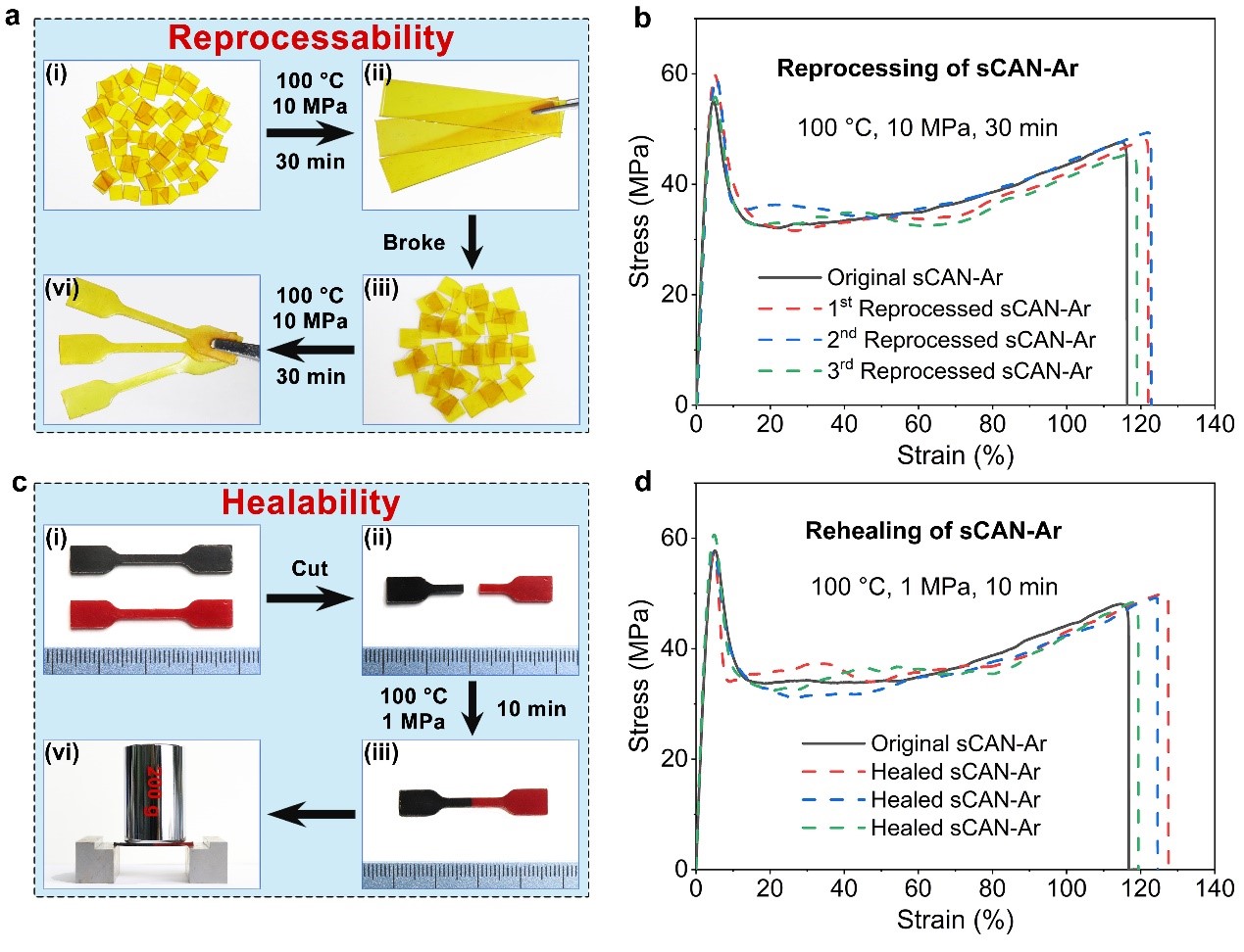 亚胺键在加热条件下的动态交换赋予了supra-CAN可循环加工和自修复性能;supra-CAN碎片可热压重塑成完整的具有特定形状的材料(图4a),断裂后可通过热压实现修复(图4c);重塑和修复后的样品可完全保持材料原始的力学性能(图4b,d)。