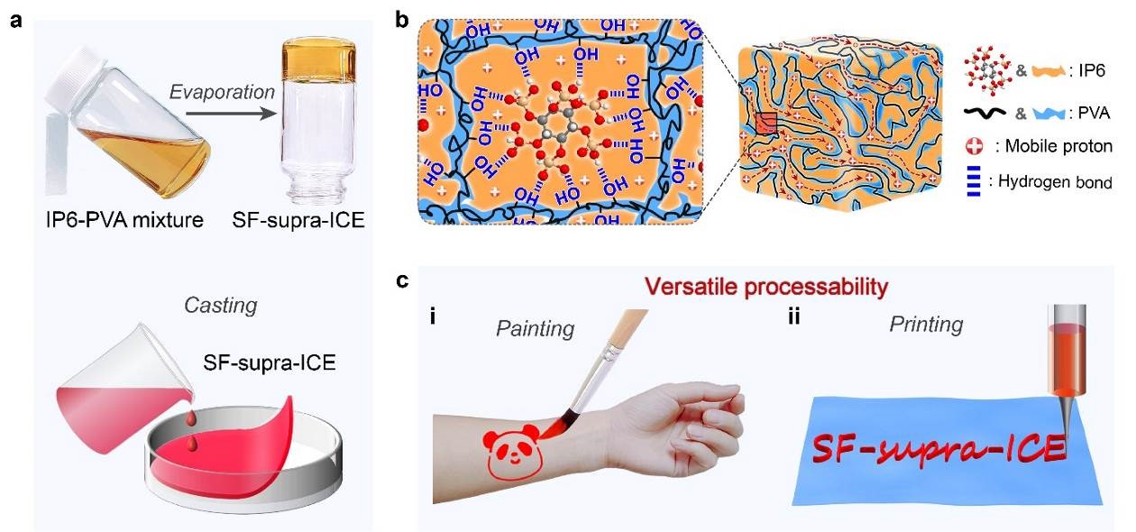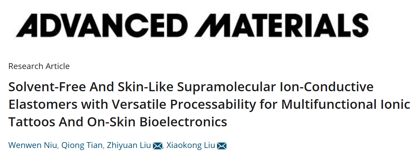 ladbrokes立博刘小孔教授课题组和深圳先进院刘志远研究员合作提出了超分子封装的理念,利用生物相容性的PVA通过高密度氢键交联对可电离的天然无毒小分子IP6进行封装,发展了兼具服役稳定性与生物安全性的无溶剂超分子离子导电弹性体(solvent-free supramolecular ion-conductive elastomer,SF-supra-ICE)。该弹性体的室温离子电导率高达3.3×10-2S m-1,具有类似皮肤的柔韧性、回弹性和应变诱导硬化特性,同时还具有高透明度、透气性、自粘附性。SF-supra-ICE的制备极为简便,仅由前驱体水溶液经一步自发的水蒸发过程即可得到,可进行多样化的加工成型。将SF-supra-ICE的前驱体溶液作为墨水,通过涂抹、绘制、打印等方式可在人体皮肤上构筑个性化的“离子纹身(I-tattoos)”,进而构建多功能的皮肤电子器件,用于人体电生理信号采集监测、人机交互、精准诊疗等领域。该工作以题为“Solvent-Free and Skin-Like Supramolecular Ion-Conductive Elastomers with Versatile Processability for Multifunctional Ionic Tattoos and on-Skin Bioelectronics”的文章发表于Advanced Materials上。