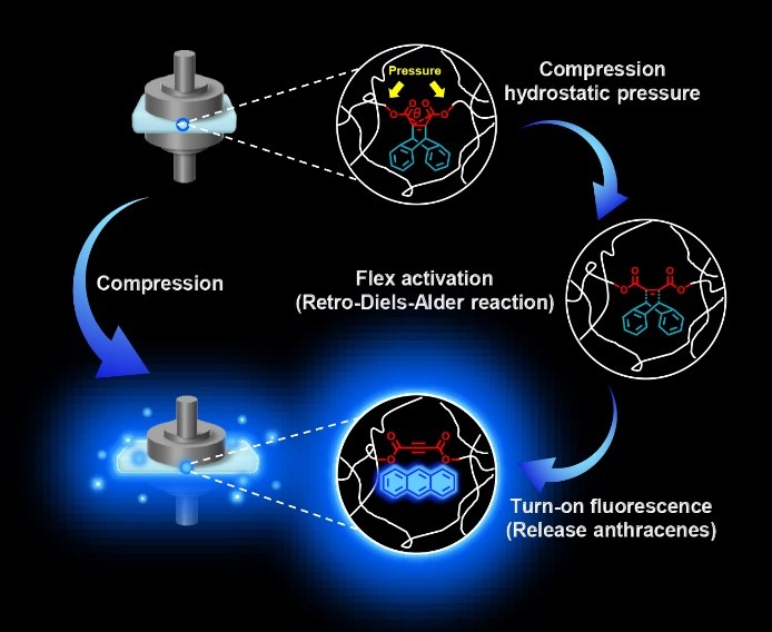 迄今为止,在微观分子层面上大多数力敏基团都是基于化学键的轴向拉伸来实现激活,并伴随着高分子主链的断裂。最近,一种新的基于特定力敏基团中键的弯曲引发化学反应的“柔性活化”机制被报道。这种新型力活化模式可以使小分子从高分子侧链中释放出来,而不破坏高分子骨架的完整性。相比之下,这种“柔性活化”对受力前后高分子材料机械性能的影响较小,因而成为了实现高分子网络中小分子控制释放的新方式。然而目前已报道的“柔性活化”型力敏基团种类有限、缺乏功能性,使其在应用时受到限制。