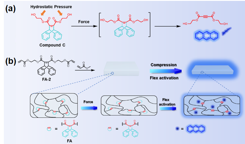 图1.本工作设计的力敏团FA的结构及其机械力诱导键弯曲释放荧光分子的示意图
