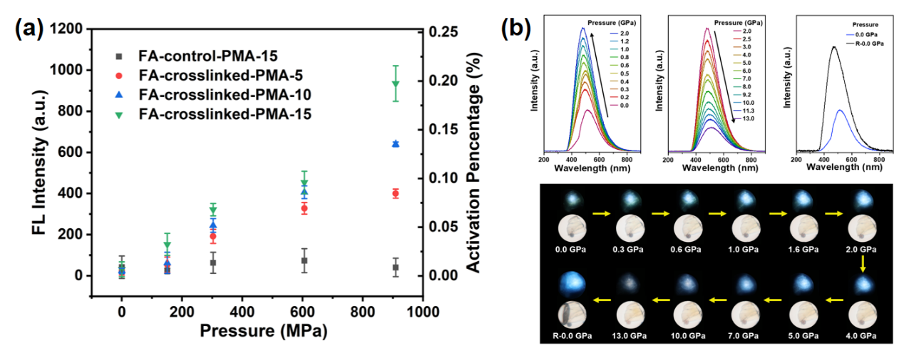 图2.(a)含FA的弹性体压缩后的荧光强度以及活化率与压力的关系图;(b)晶态FA在加压和卸压过程中的荧光谱图和照片