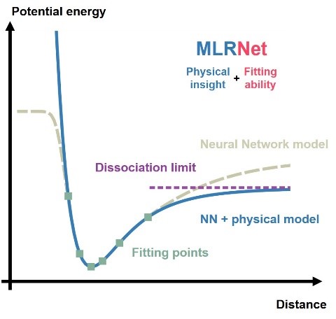 近日,ladbrokes立博、理论化学研究所李辉教授课题组在《Journal of Chemical Theory and Computation》上发表了题为” MLRNet: Combining the Physics-Motivated Potential Models with Neural Networks for Intermolecular Potential Energy Surface Construction”的研究工作。该工作讨论了一种“物理模型+神经网络”的理论框架,通过将神经网络嵌入物理势能函数的方式,同时结合神经网络和物理模型在势能拟合中的优势。基于该框架,作者提出了一种用于光谱精度分子间相互作用势拟合的神经网络模型,MLRNet模型。该模型突破了传统神经网络模型在相互作用长程和短程渐近区拟合效率低、外推误差大的问题,并展现出很高的拟合精度和高维拟合效率,为未来神经网络势能模型的发展提供了新思路。