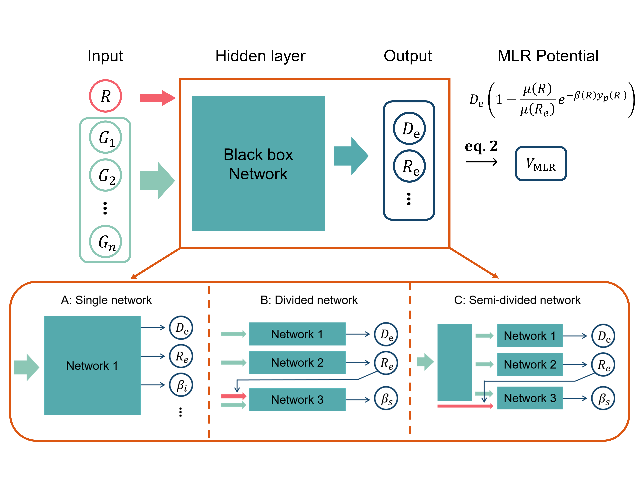基于上述问题,李辉课题组将神经网络模型和mdMLR模型有机结合,发展了MLNet模型,从而充分发挥两者在势能拟合上的优势。该工作中的MLRNet模型采用独立的子网络表示mdMLR函数中的物理参数。考虑到神经网络通常不具备置换对称性和mdMLR模型对输入变量的需求,该工作采用了分子质心间距和该间距无关的置换不变多项式作为模型的输入,从而在保证了物理对称性的同时,满足mdMLR势能函数对参数的基本要求。