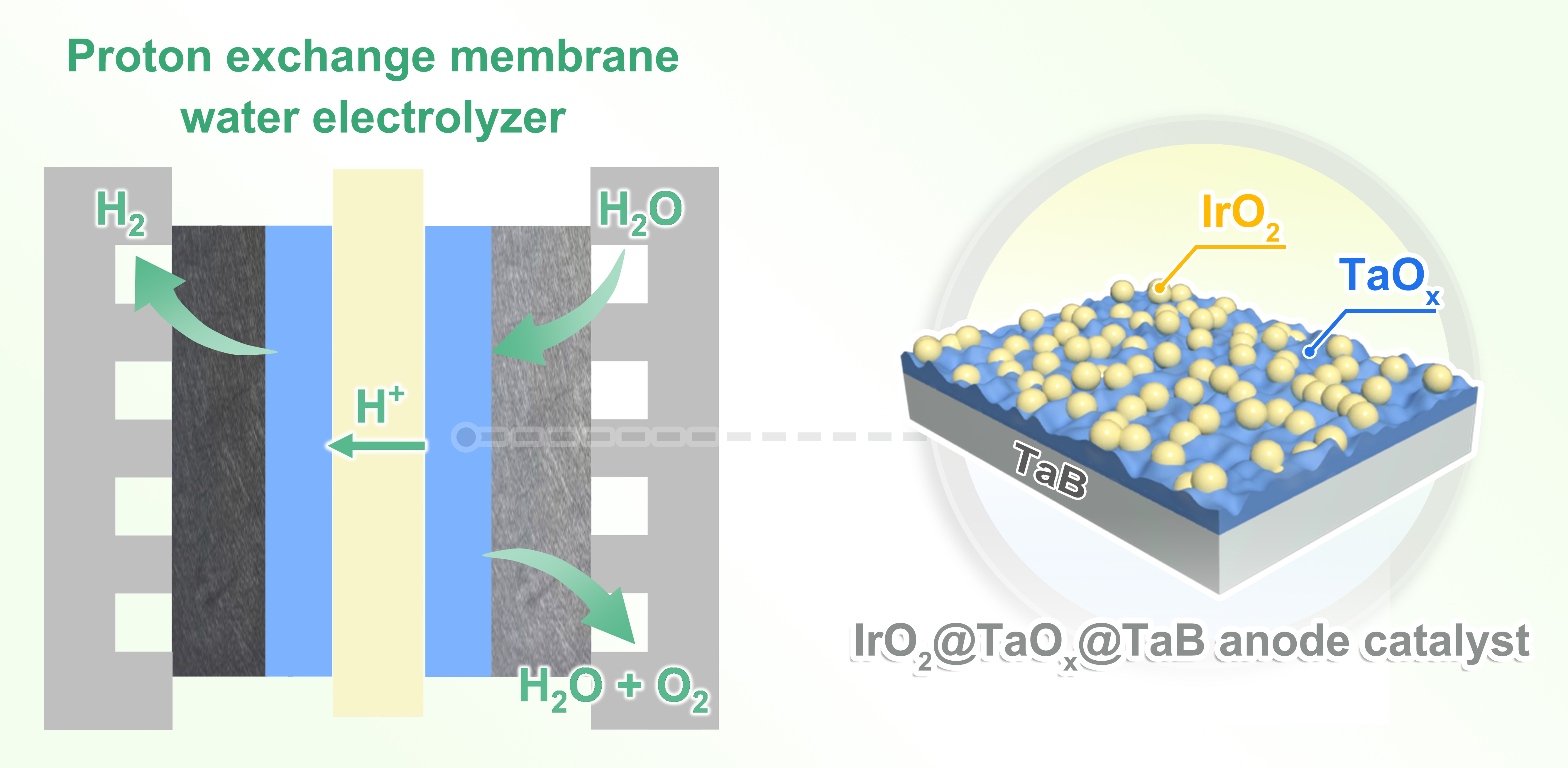 IrO2@TaOx@TaB负载型氧化铱催化剂用于质子交换膜电解槽阳极催化层的示意图。