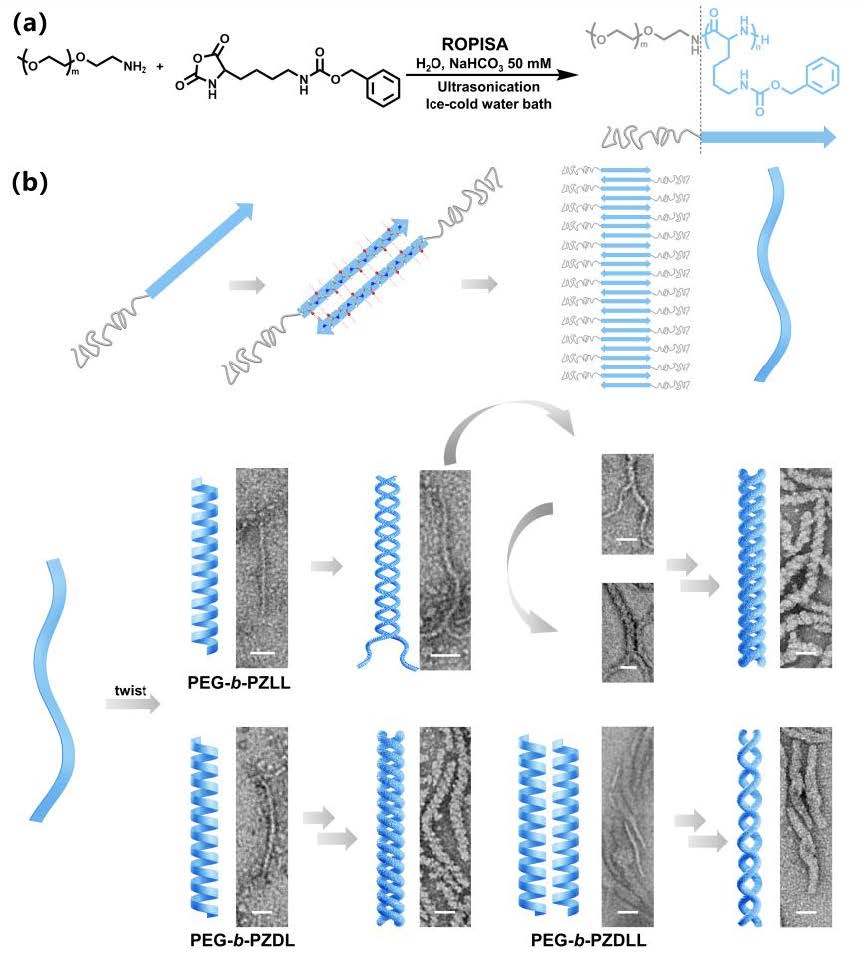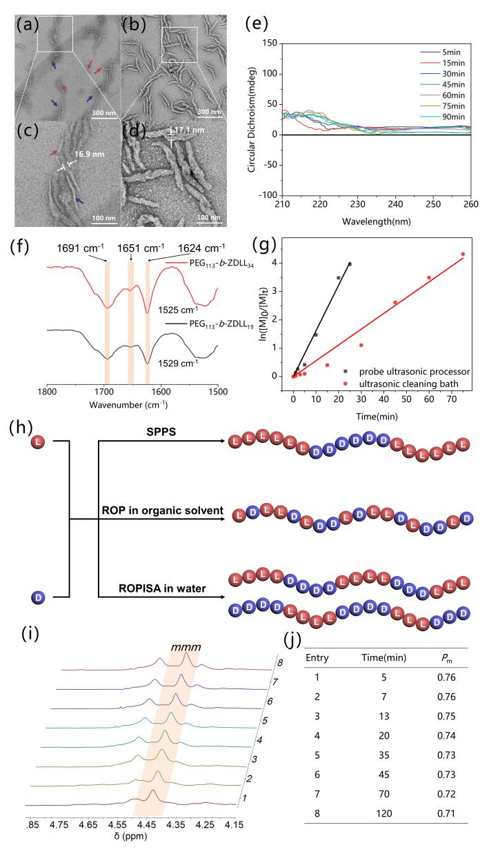 针对这个难题,ladbrokes立博陈学思院士、孙静教授课题组借鉴天然蛋白质可自发形成高度有序多级手性超分子结构,率先提出了在超声辅助条件下,采用大分子引发剂mPEG-NH2引发ε-苄氧羰基-L/D-赖氨酸N-羧基内酸酐(ZLL-NCA/ZDL-NCA)单体在水相中开环聚合诱导自组装(ROPISA),在数分钟内高效制备了多级手性超螺旋结构,进一步诱导等摩尔外消旋单体实现立体选择性聚合,合成了具有较高立构规整度的聚肽高分子。该工作以题为“Fast Catalyst-Free Synthesis of Stereoselective Polypeptides via Hierarchical Chiral Assembly”的文章发表在Journal of the American Chemical Society 上。