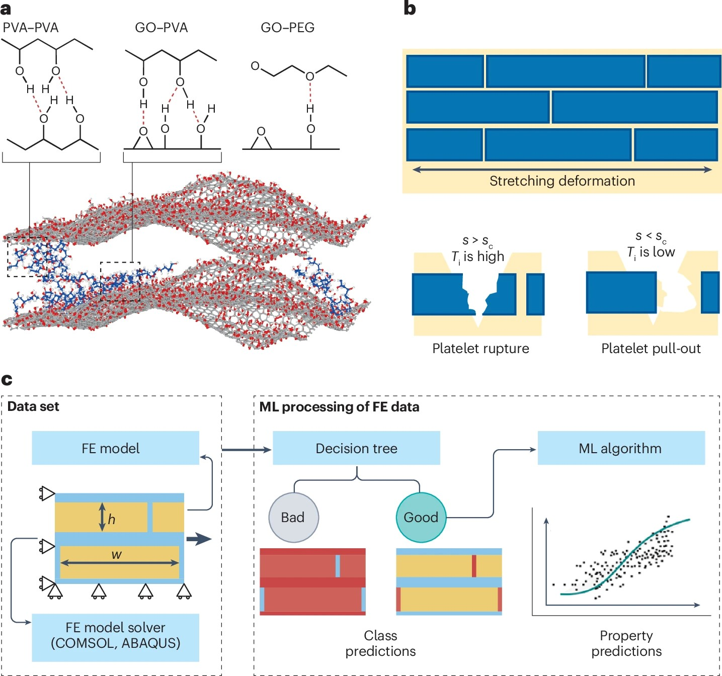 此外,作者还讨论了分子动力学模拟、机械模型和机器学习在定量仿生学中的重要作用(图4)。机器学习可以作为在相应的泰勒级数中建立性质微分的一般途径,非常适合大多数非线性的属性差异预测。将理论、模拟和机器学习相结合,为利用具有高体积密度界面、图论描述、以及分层多尺度结构来实现性能的多维度优化提供了有力的支持,也是定量仿生学的关键所在。