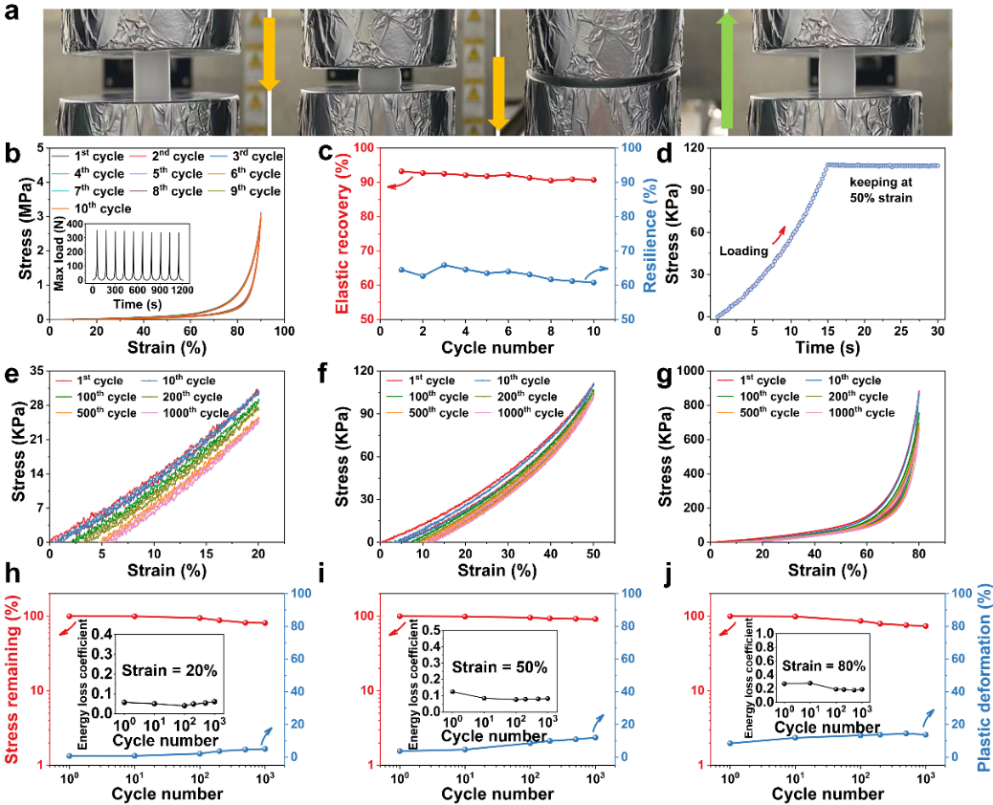 DN-MMs水凝胶电解质在循环压缩状态下,内部结构依据保持稳定,同样具有优异的抗疲劳性能。