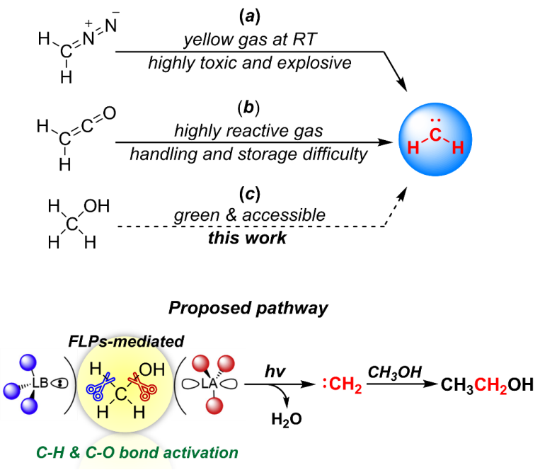 卡宾作为一种高活性中间体,其可控合成一直是合成化学领域的核心挑战。传统的卡宾合成方法通常依赖于重氮化合物或烯酮前体,这些方法不仅存在爆炸风险,而且对环境造成较大危害。近年来,甲醇被提出作为一种理想的前体制备亚甲基卡宾(:CH₂),副产物仅为水,有望大大提升合成过程的安全性和绿色性。此外,亚甲基卡宾能够与甲醇进一步反应生成乙醇,这一反应能将来源广泛但具有较高毒性和低能量密度的甲醇转化为高附加值的乙醇,为清洁能源载体的开发以及绿色化工提供重要的创新思路。然而,实现这一转化过程需要同时活化甲醇分子的C-H键和C-O键,仍然面临极大的挑战。