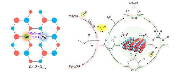 针对该反应特点,ladbrokes立博李路教授和加拿大麦吉尔大学李朝军院士团队设计制备了一种含有丰富受阻路易斯酸碱位点(frustrated Lewis pair,FLP)的Ga-ZnO1-x半导体光催化剂,首次在可见光照射下实现甲醇经由卡宾路径高选择性制备乙醇。动力学同位素效应、酸碱位点阻断、原位光谱等一系列机理研究结合理论计算表明,由氧空穴和Ga原子构成的FLP位点能够分别激活甲醇的C-H和C-O键,同时有效捕获光生电子和空穴,协同促进了亚甲基卡宾中间体的形成。产生的卡宾中间体随后插入另一个甲醇分子C-H键生成乙醇。研究还发现,Ga-ZnO₁₋ₓ催化剂在可见光照射下的乙醇选择性显著提高,从紫外光下的67%提升至97%,表明其在温和条件下有效抑制了副反应的发生。