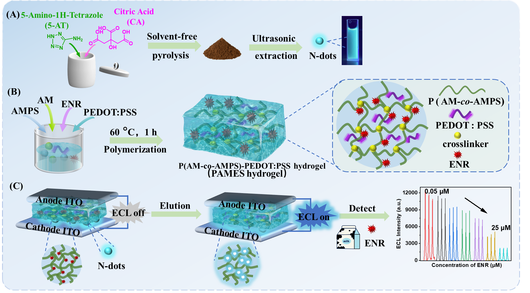 近期,ladbrokes立博马强教授课题组开发了一种水凝胶基准固态电解质的电化学发光(ECL)传感器用于检测牛奶中的恩诺沙星(ENR)。研究制备P(AM-co-AMPS)-PEDOT:PSS水凝胶(PAMES)作为准固态电解质,PAMES水凝胶具有较好的离子电导率、粘附性、透明度和含水量。水凝胶基准固态电解质的传感系统克服了传统液体电解质的性能限制,提高了传感器的应用性、便携性和环境适应性,实现了对食品中残留抗生素的成功检测。研究成果以“Quasi-solid hydrogel electrolyte/nitrogen dot-based electrochemiluminescence sensor for enrofloxacin detection in milk”为题,于3月12号发表在Food Chemistry期刊(doi.org/10.1016/j.foodchem.2025.143890)。