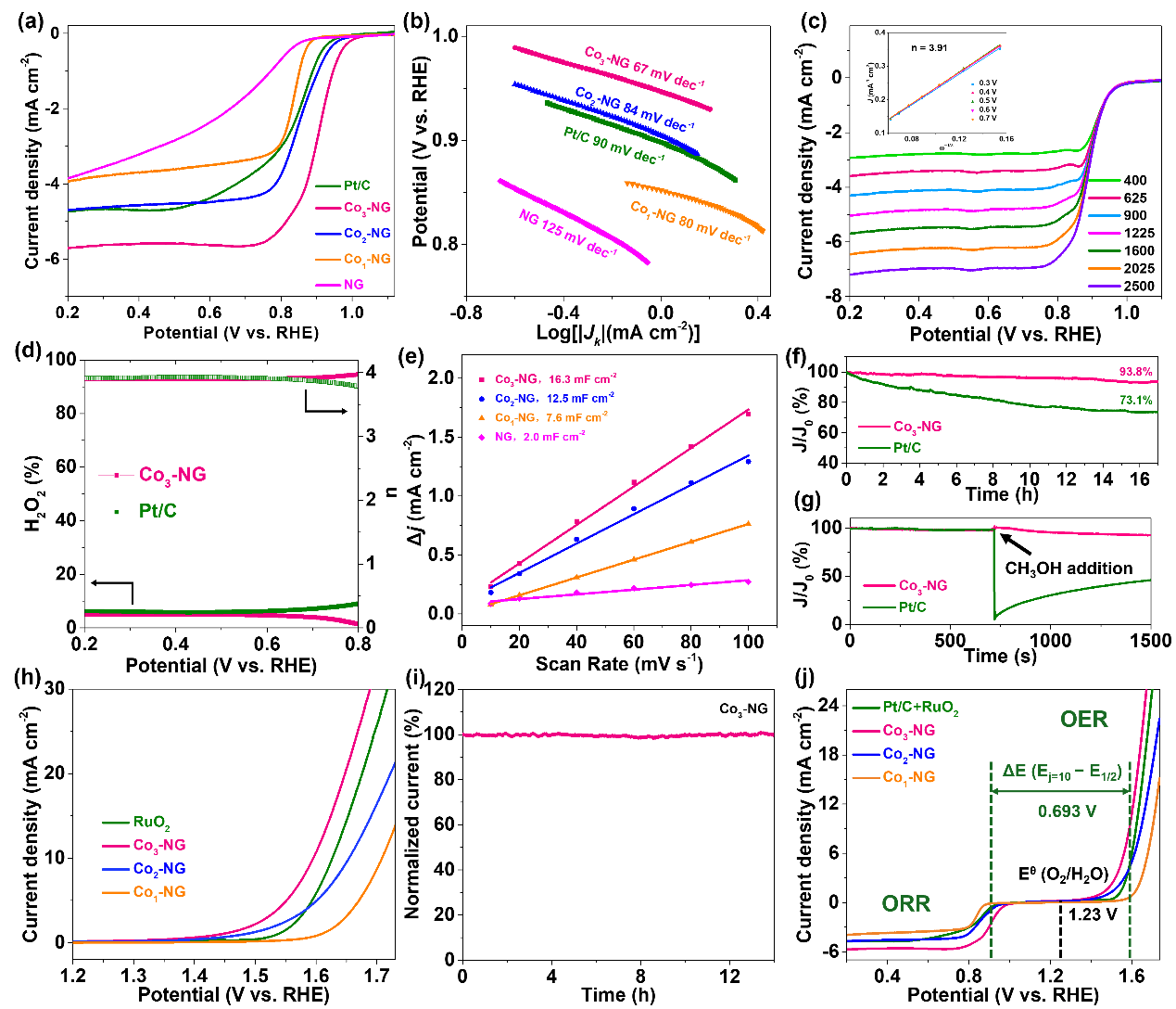 Co3-NG催化剂表现出优异的双功能ORR/OER活性和稳定性,优于商业Pt/C和RuO2,Co3-NG催化ORR的E1/2为0.903 V,OER在10 mA cm−2的电流密度下的过电位为366 mV。此外Co3-NG组装的ZAB具有优异的性能。其最大功率密度和比容量可达到189.0 mW cm−2和770.3 mAh gZn−1。此外,Co3-NG组装的ZAB在充放电循环500 h后输出电压几乎保持不变,而Pt/C+RuO2组装的ZAB在120 h后出现明显的退化。