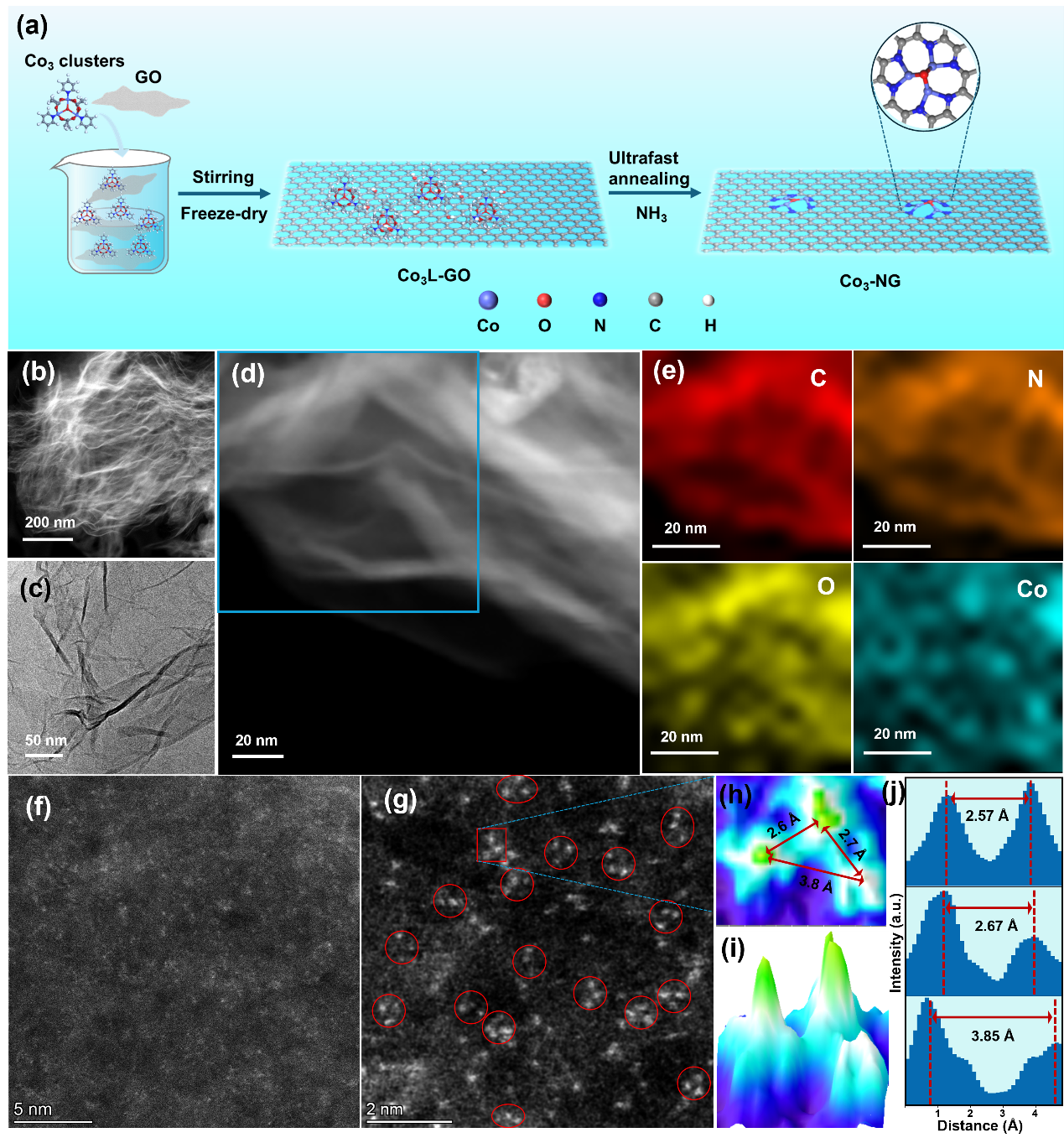 通过静电作用将预先合成的三原子钴簇前驱体吸附在石墨烯上,利用焦耳热高温冲击波技术将前驱体快速锚定到载体上得到三原子钴催化剂(Co3-NG)。透射电镜结果显示钴均匀地分散在石墨烯纳米片上,球差电镜结果证实了钴三原子位点的存在。