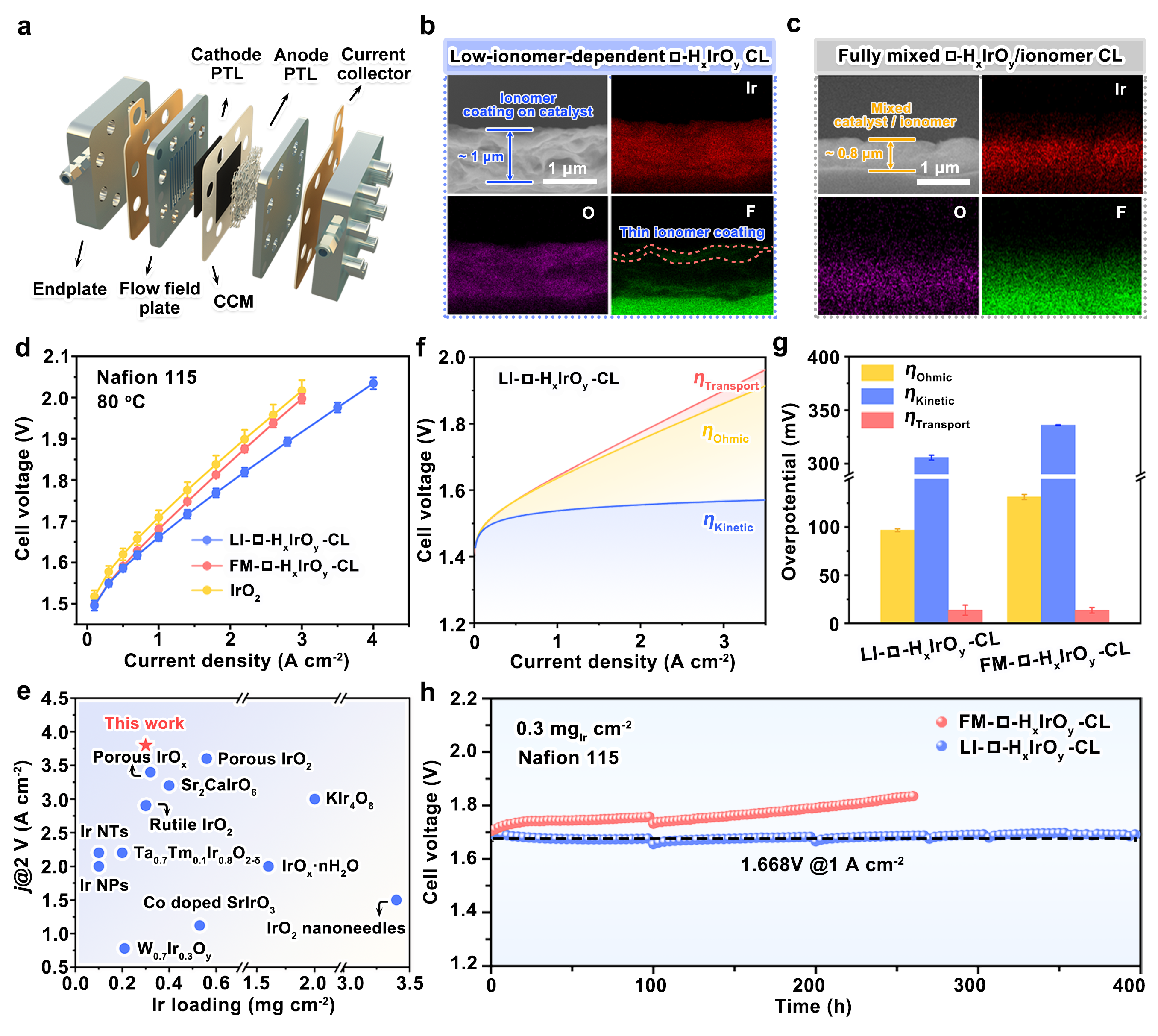 以*-HxIrOy作为阳极催化剂制备了膜电极,并进行了催化性能测试。值得一提的是,由于*-HxIrOy自身的质子传导特性,以其制备的阳极催化层只需表面覆盖离聚物充当粘合剂作用,其内部85%的催化剂可不与离聚物接触。这一独特的催化层结构避免了离聚物电绝缘性带来的活性位点覆盖和电子传导受阻问题,可实现铱原子利用率的最大化。所构筑的阳极催化层在低铱载量(0.3mgIr/cm2)、Nafion™ N115膜条件下,2V电压可达到3.8A cm⁻²电流密度,并稳定运行400小时,展现出优异的电解水性能(图4)。