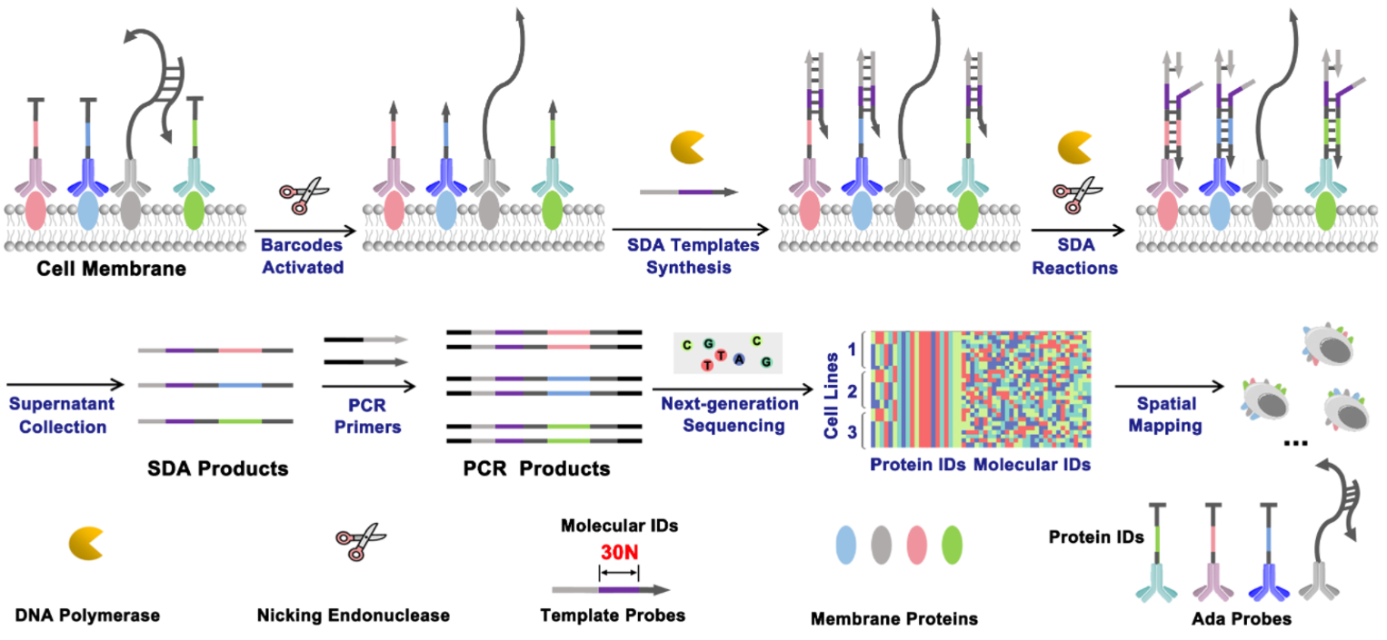 近日,ladbrokes立博宋大千教授团队的孙颖教授与西安交通大学赵永席教授团队在复杂细胞纳米环境的蛋白质相互作用分析中取得重要进展。细胞结构的维持和功能调节在很大程度上取决于许多膜蛋白的组成和空间分布。然而,目前的方法在空间覆盖和数据可扩展性方面存在局限性,阻碍了对复杂细胞纳米环境中蛋白质相互作用的全面分析。针对上述挑战,团队提出邻近激活DNA扫描测序技术(Proximity-Activated DNA Scanning Encoded sequencing,PADSE-seq),将大规模的蛋白质邻近信息转换为DNA条码信息,实现了十种以上膜蛋白邻近位置关系的纳米尺度分析。相关成果以“Proximity-Activated DNA Scanning Encoded Sequencing for Massive Access to Membrane Proteins Nanoscale Organization” 为题,于4月11日发表于Proceedings of the National Academy of Sciences of the United States of America上。