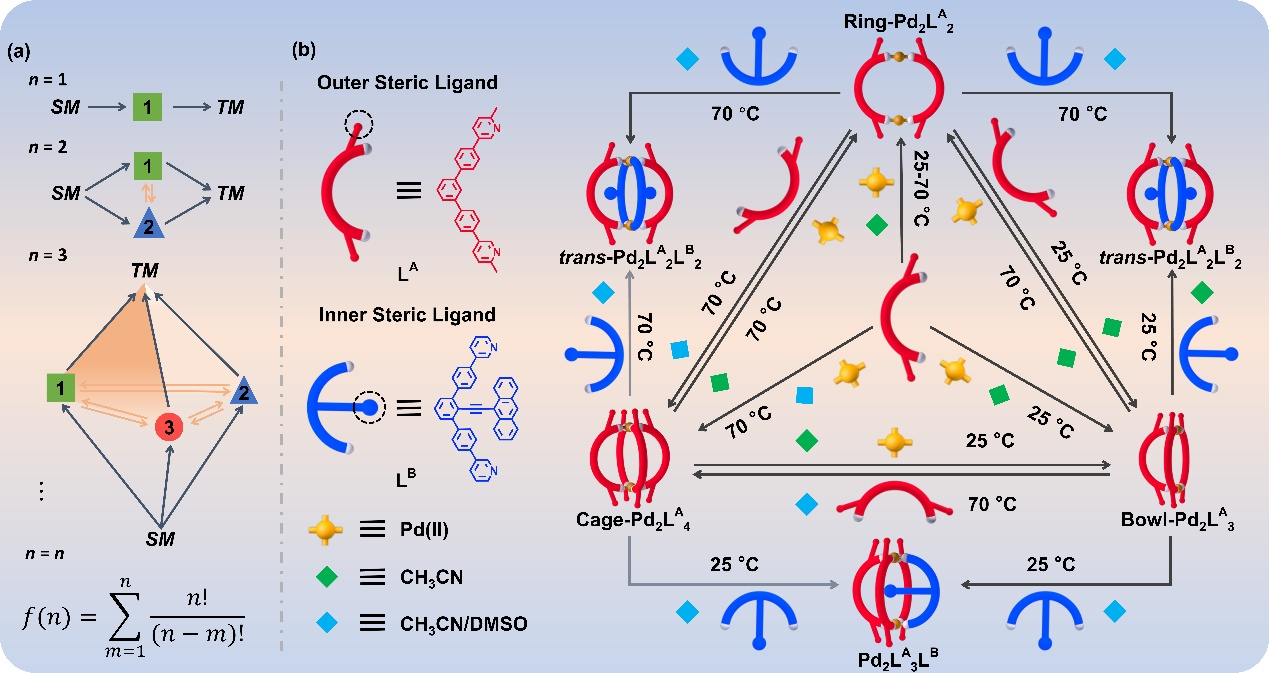 基于内外位阻协同策略实现超分子笼路径工程示意图。