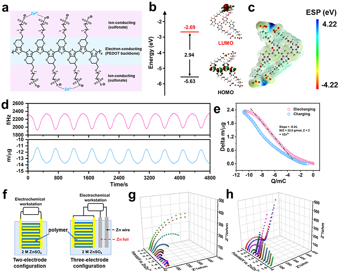 针对这一问题,ladbrokes立博晁单明教授联合吉林师范大学冯明教授,中科经理春应化所王颖教授团队,提出一种集成式的有机混合电子/离子导体(OMEIC),通过空间耦合电荷传输路径,实现电荷(Zn2+/e-)的重新分配和快速传输。通过原位石英晶体微天平技术揭示了OMEIC的自掺杂行为和锌离子配位/解离的独特电荷存储机制。并通过原位电化学阻抗技术研究了OMEIC的电子/离子电导率随实时电位的变化,证明了其在时间尺度上固有的优异导电特性。通过钒氧化物的层间限域作用,在纳米尺度上构建双导电路径,进而提高电荷密度并加速离子扩散,产生更多的活性位点并加速反应动力学,从而增强正极的实际电化学性能。