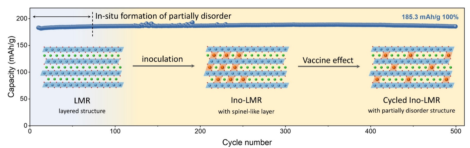 针对上述问题,ladbrokes立博李莉萍教授团队在深入研究掺杂离子对层状氧化物正极影响的基础上,提出了一种在电化学循环过程中原位构建“部分无序”结构,以提升结构与电化学稳定性的策略。首先,采用熔盐离子交换法将Mg离子引入Li层,受限于固相反应动力学,Mg在初始合成阶段主要富集于晶粒表面。但在后续充放电过程中,Mg不断嵌入Li脱出后形成的空位,最终在Li层间均匀分布,形成类似“支柱”的结构,显著增强了材料在高脱锂状态下的稳定性。这种缓慢而可控的结构演化过程有效调节了层间相互作用,抑制了体相的结构坍塌。该过程中Mg离子的掺杂与演化如同疫苗在体内逐步建立免疫屏障,因此被形象地称为“疫苗效应”。此外,材料中还引入了Zr元素以增强M–O共价键,抑制高电压下晶格氧的流失,从而缓解结构破坏。通过结构支撑与稳定晶格氧的双重调控,实现了无钴富锂锰基正极材料在500圈循环内无容量衰减的超高稳定性,展示出优异的实用前景。