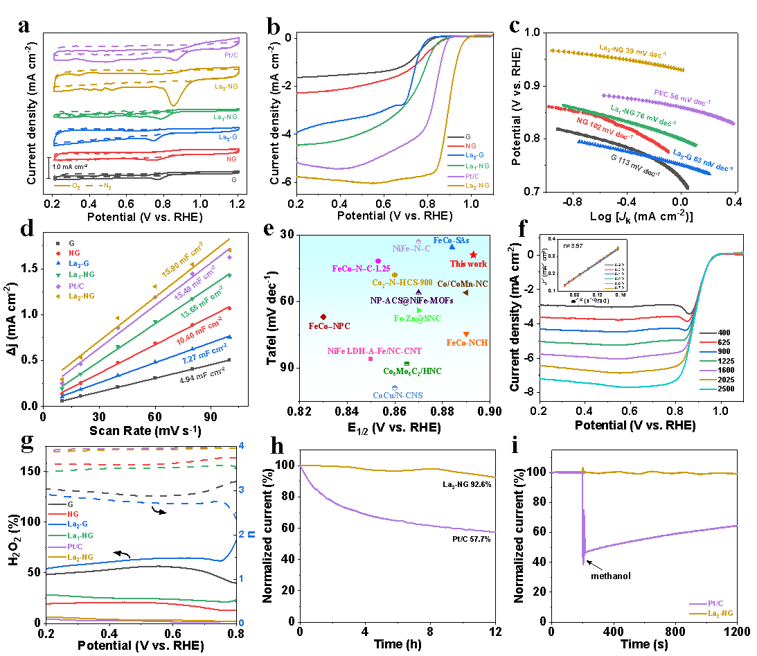 人口的急剧增长和能源的过度消耗推动了能量储存和转换装置的发展。ZABs因其良好的可持续性、便携性、经济可行性和高能量密度而被认为是最有吸引力的候选电池之一。阴极的ORR是制约ZABs效率的关键因素。由于复杂的反应过程和缓慢的ORR动力学,开发低成本和高性能的ORR电催化剂非常重要。稀土镧元素具有大的原子半径、多壳层轨道电子和类芬顿反应惰性,在其上容易形成局域化的高配位结构,有利于反应中间体的吸附。稀土元素具有特殊的4f壳层电子构型,可以引入可调的电子性质和显著的自旋轨道耦合到耦合的d带中心,从而提高电催化性能。并且混合价态的稀土金属可以增强氧化还原性能,从而增强ORR活性。然而,对于单原子镧位点,由于所有最外层s和d电子的损失,几乎空的最外层轨道是稳定的,对于ORR是不活跃的。近年来,作为SACs的扩展,双原子催化剂(DACs)不仅具有SACs的优点,而且具有更灵活的活性中心和更高的金属含量,并且它们之间存在的协同作用可能突破单原子催化剂的限制。然而,目前定向控制构建双原子稀土金属活性位点仍然面临着巨大的挑战。