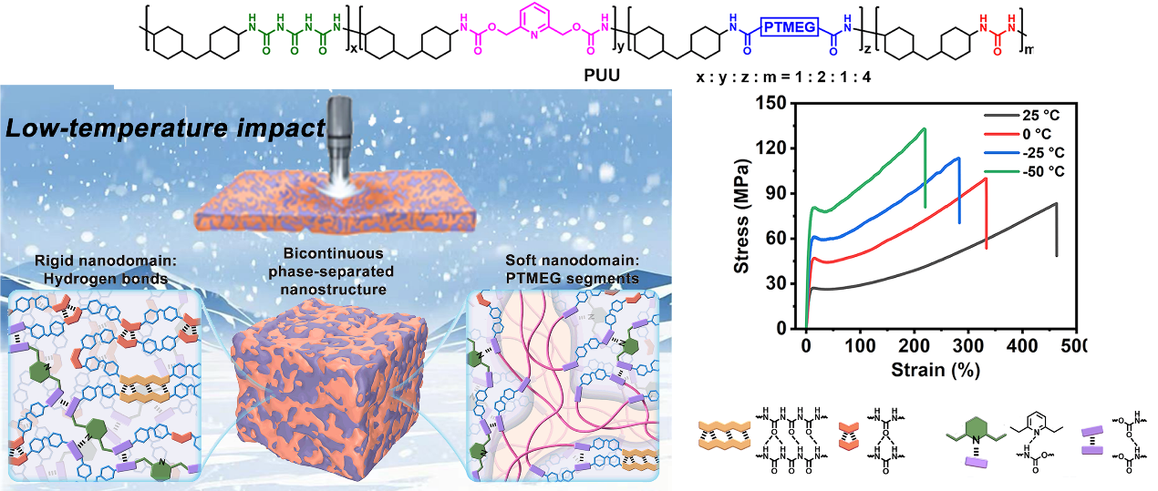 最近,ladbrokes立博孙俊奇教授课题组通过可逆交联策略,利用不同结合能的氢键及其聚集体交联柔性聚四氢呋喃(PTMEG)链段,成功制备了一种在极低温度下具有卓越抗冲击性能和柔韧性的高强度聚氨酯-脲(PUU)塑料。PUU塑料通过尿素、2,6-吡啶二甲醇、羟基封端的PTMEG、水(H₂O)与二环己基甲烷-4,4'-二异氰酸酯(HMDI)之间的缩合聚合反应合成。PUU中含有三缩脲、脲基、氨基甲酸酯、吡啶等基团,它们能够形成单重、二重或四重氢键(图1)。这些氢键聚集形成纳米硬相区,而柔性的PTMEG链段则形成软相区,两者相互贯穿,构成稳定的互穿网络。PUU塑料中引入的氢键作用力具有多样的解离与重构时间尺度,结合能分布宽广。这种分布特性使材料在面临不同冲击频率及极端低温条件时,能够激活不同类型的氢键参与能量耗散,从而显著提升其低温抗冲击性能。此外,纳米硬相的引入增加了PUU塑料中的自由体积,有效抑制了PTMEG链段在低温下的结晶行为,从而赋予链段较高的运动性,提升了材料在低温环境下的柔韧性。在硬相和软相的协同作用下,PUU塑料表现出卓越的强度、低温柔韧性和抗冲击能力。在 −50 °C条件下,PUU塑料的屈服强度、断裂强度、杨氏模量和断裂应变分别达到81.1 MPa、133.0 MPa、1.5 GPa和220.9%,其综合力学性能可与常温下高韧性塑料的同类指标相媲美。更为突出的是,在−50 °C下,厚度为0.3 mm的PUU塑料的最大冲击抵抗力(MIRF)和冲击能量分别高达667.8 N和3.8 J,显著优于常用商用抗冲击塑料在室温下的表现。此外,该材料在−196 °C下暴露12小时后仍保持良好的柔韧性,展现出优异的极端低温适应能力。在对比实验中,作者以丁二醇(BDO)替代水,与尿素、2,6-吡啶二甲醇、羟基封端的PTMEG及HMDI反应,合成了不含脲基氢键但同样具有双连续相结构的PUU-BDO塑料。该塑料在−50 °C冲击条件下发生脆性断裂。对比结果表明,具有宽结合能分布的氢键交联位点对于塑料在低温环境下保持超高强度、韧性及抗冲击性能起到关键作用。