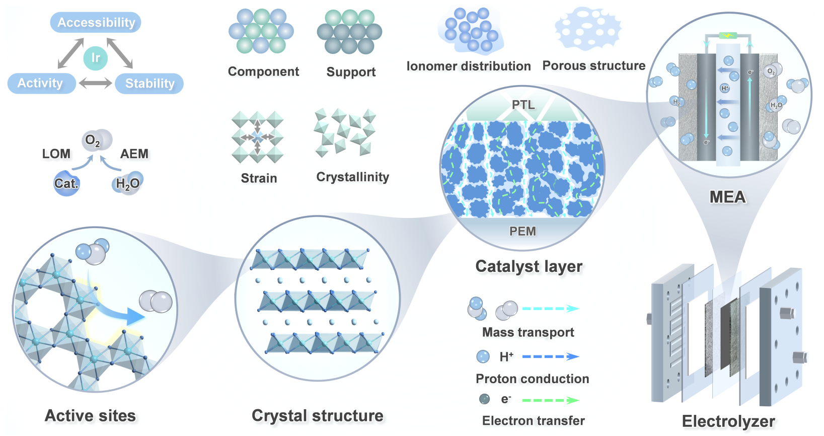 为突破瓶颈,文章提出应从活性位点调控到催化剂组装,开展跨尺度结构设计,实现材料层与电极层的系统优化(图3)。在材料层面,应构建兼具高活性、高稳定性与可达性的铱位点。在电极层面,则需构筑具备导电网络与有效传质通道的三维结构,显著提升铱利用率。该综述不仅为低铱催化剂的设计提供了系统思路,也为PEMWE制氢技术的规模化提供了理论支撑和研究方向。