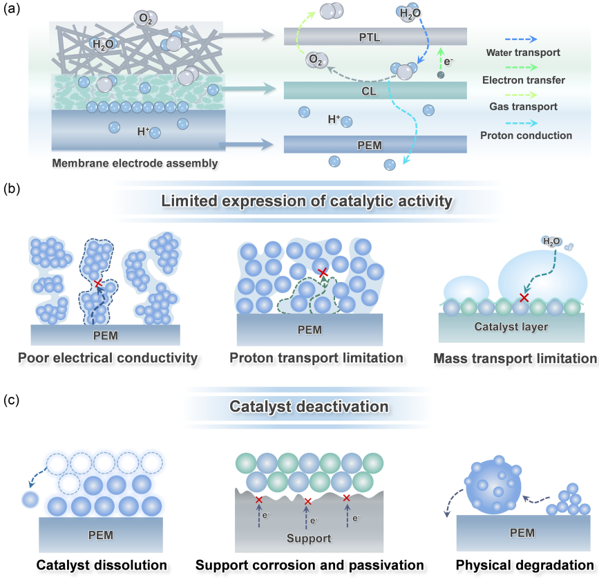 本文系统解析了PEMWE阳极催化层的功能构成(图1),包括催化反应、电子传导、质子传输及水/氧等分子的扩散。在强酸性、高电压、大电流密度和气液交替的极端运行条件下,催化剂不仅需具备高活性与高稳定性,还必须实现电子、质子与反应分子的高效协同传输。传统氧化铱体系依赖高载量维持性能,显著制约其低铱化潜力。铱负载降低易引发“孤岛效应”,造成电子传导不连续、电流分布不均,加剧催化剂团聚与失活。