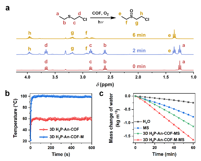 针对上述科学问题,本文首次设计并合成了一系列具有二重互穿lvt-b拓扑的三维卟啉共价有机框架(3D Por-An-COF)。该三维结构实现了卟啉单元在共轭骨架中的周期性排列,有效促进了光子捕获及客体分子与活性中心的相互作用,从而赋予材料卓越的光响应特性,包括高效的太阳能–化学能和太阳能–热能转换能力。通过一系列实验,系统评估了这些COFs的维度依赖性光响应特性。以2-氯乙基乙基硫醚(CEES)作为硫芥气的模拟物,测试了3D H2P-An-COF对其光降解性能。实验结果表明,在白光照射下,CEES在3D H2P-An-COF催化作用下于6分钟内完全降解为无毒产物1-氯-2-乙基亚磺酰基乙烷(CEESO)。通过电子顺磁共振(EPR)光谱证实了单线态氧的产生,表明3D H2P-An-COF在光照下能有效生成活性氧物种,从而促进CEES的降解。此外,用魔力蓝(Magic Blue)对3D H2P-An-COF进行修饰,制备得3D H2P-An-COF-M。在808nm激光照射下,该材料温度可迅速升至约100℃。基于此材料构建的界面水蒸发系统实现了1.64 kg∙m−2∙h−1的蒸发速率,相关热电装置可产生195 mV的输出电压,足以点亮微型商用LED灯。