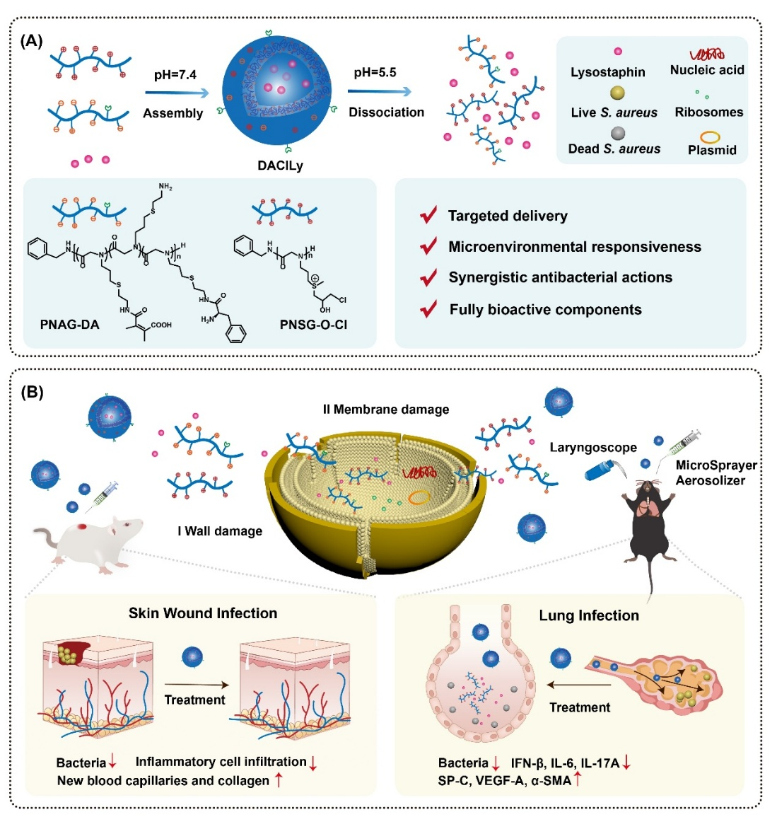 研究团队基于静电作用,将两种带相反电荷的聚类肽材料——含硫鎓聚类肽(PNSG-O-Cl)和2,3-二甲基马来酸酐修饰的含氨基聚类肽(PNAG-DA)——组装成纳米囊泡结构(图1)。进一步,将可特异性切割金黄色葡萄球菌细胞壁的溶葡萄球菌酶(Lysostaphin, Ly)封装于囊泡内部。此外,通过在囊泡表面修饰D-氨基酸,赋予其靶向识别能力,使其能精准富集于细菌感染部位。在健康的人体组织中,DAClLy纳米囊泡保持结构稳定,从而最大限度地降低对正常组织的毒副作用。一旦抵达细菌感染区域,该处因细菌代谢所致的酸性微环境会触发囊泡的响应性释放机制,迅速释放出包载的溶葡萄球菌酶及带正电的抗菌聚类肽。溶葡萄球菌酶可以高效降解细菌细胞壁的肽聚糖结构,增强聚类肽对细胞膜的接触,进而通过破坏膜结构实现高效杀灭细菌。这种级联协同作用产生了1+1>2的强效抗菌效果,使耐药菌难以逃脱。