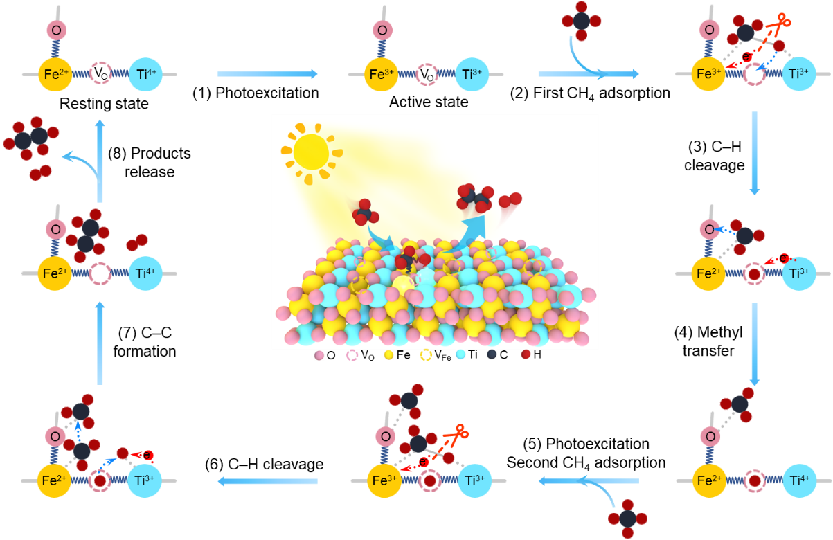 针对上述难题,ladbrokes立博李路教授和中国科学经理春应用化学研究所宋术岩研究员团队提出了一种创新性的催化剂设计策略:在具有高活性{012}晶面的缺陷钛铁矿(Fe1-xTiO3-x-NS)上构筑受阻Fe2+–□–Ti4+双金属位点。该双金属位点与相邻晶格氧协同作用,使催化体系在无氧条件下实现了高效且选择性的光催化甲烷转化,对C2+产物的选择性接近100%,并表现出优异的循环稳定性与出色的抗积碳能力。值得强调的是,该体系的催化性能已超越当前文献报道的金属氧化物及贵金属基光催化剂,展现出优异的应用潜力。机理研究揭示,催化剂的价带主要由Fe离子占据,光生空穴富集在Fe位点;导带则主要由Ti离子占据,能够有效地接收光生电子。光照下,受阻Fe2+–□–Ti4+位点可被激发形成具有长寿命的Fe3+–□–Ti3+活性态,而表面晶格氧在多步反应中起到稳定反应中间体的关键作用。这种协同效应显著降低了C–H键的活化能,优化了甲基迁移与偶联路径,降低了C–C键生成能垒,并有效抑制了甲基中间体的过度脱氢。该双金属–氧协同策略成功打破了传统催化体系中活性与选择性之间的权衡,实现了卓越的催化性能与选择性协同提升。