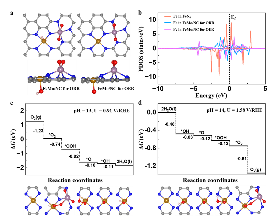 针对上述问题,管景奇教授团队利用Fe-SAC的蚀刻、Mo离子吸附与高温活化的联合策略,成功实现了可控合成的FeMo/NC催化剂。多项物理表征揭示了FeMo/NC呈现双原子位点结构,具有FeMoN7构型,其中Fe和Mo原子通过一个N原子形成桥连结构。FeMo/NC展现出优异的氧催化活性与稳定性,且在可充放电锌空气电池和柔性锌空气电池中均表现出优异性能,具有未来应用潜力。原位X射线吸收光谱与拉曼实验揭示,Fe与Mo原子耦合形成*Fe-O-O-Mo*中间体,参与氧物种转化过程,在动力学上更有利于ORR/OER。密度泛函理论计算证实,由于Fe与Mo原子协同催化作用,双原子Fe-Mo位点相较于单原子Fe/Mo位点具有更低的ORR/OER能量障碍。因此,本研究通过原位实验与理论计算为Fe-Mo双原子催化剂在氧电催化中的结构演变与反应机理提供了独特的阐释。