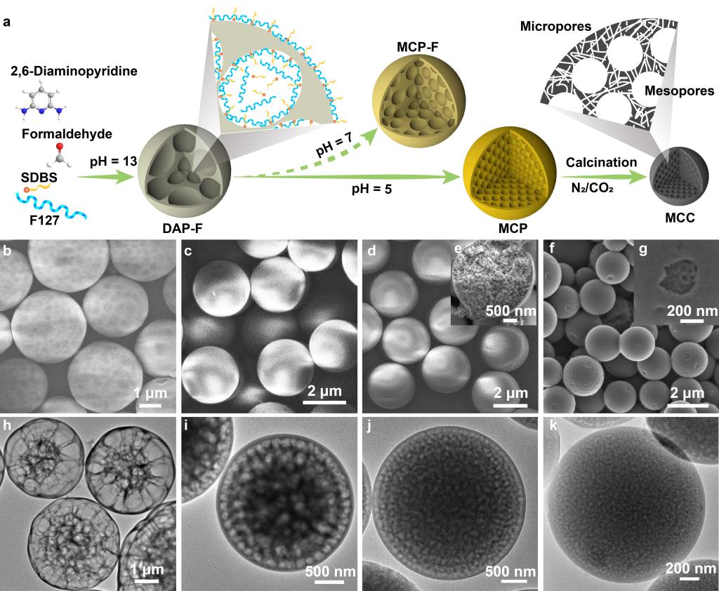ladbrokes立博乔振安教授课题组提出了一种表面活性剂诱导的限域聚合策略来合成具有精细结构的氮掺杂多腔室碳微球(MCC)。这种碳球的前驱体是一种基于2,6-二氨基吡啶(DAP)的新型多腔室聚合物(MCP)。如图1所示,一锅法合成MCP包含了两个聚合步骤。第一步在碱性溶液中DAP与甲醛生长成类细胞骨架结构的预聚物DAP-F。在聚合过程中聚合物表面活性剂F127和阴离子表面活性剂十二烷基苯磺酸钠形成双表面活性剂体系来控制DAP-F预聚物的生长。其中,F127用作空间稳定剂来防止DAP-F颗粒团聚。DAP分子中的氨基集团可以降低阴离子表面活性剂负电基团的静电排斥,导致表面活性剂排列成囊泡来减少端基基团的裸露面积,从而导致DAP-F中大空腔的形成。加入乙酸后开始第二阶段的聚合,随着溶液pH的降低,DAP-F预聚物发生进一步交联,其在微球限域空间中的聚合导致大腔室空间分隔形成丰富的小腔室。