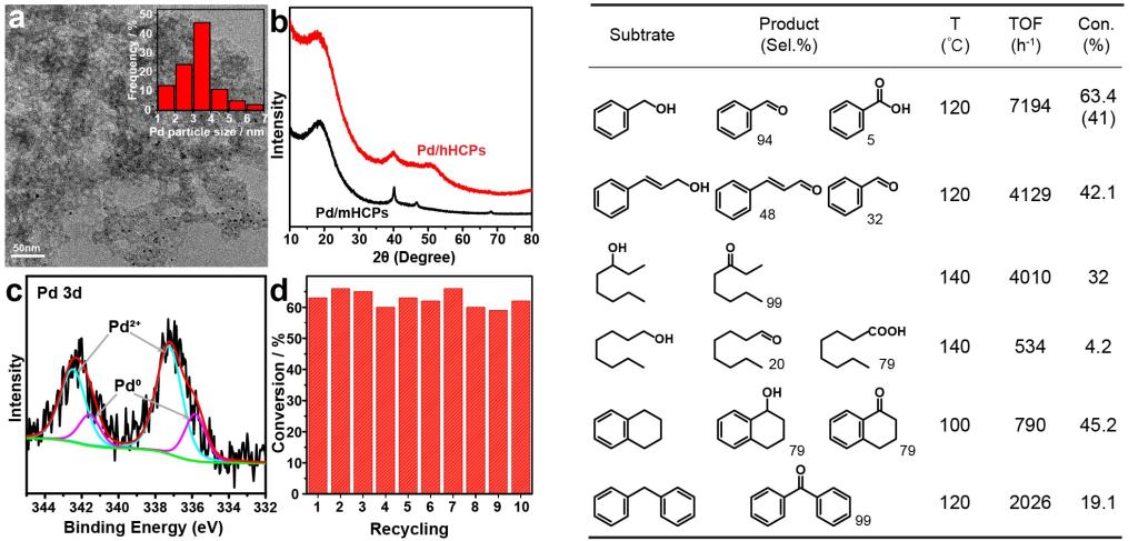 由于双嵌段共聚物PEO-b-PS的特殊化学结构,PEO嵌段全部附着在孔道内部,为孔道内部提供了一个亲水的微环境,非常有利于定向担载金属纳米颗粒,我们用原位还原法法在孔道内担载了贵金属纳米粒子Pd,并进行碳氢活化的无溶剂催化氧化测试,苯甲醇在120 oC下转化率可达64%,选择性94%